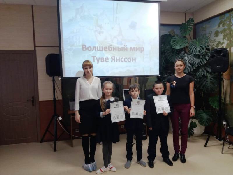 Библиотекарь Казакова Л.М. рассказала ученикам 4 «В» (кл.руководитель Капрош А.А.) и 4 «Д» (кл.руководитель Иванова А.Н.) классов школы №1 биографию Янссон Т.М. Далее дети отвечали на вопросы интерактивной игры. За хорошую подготовку самым активным ребятам были вручены грамоты.