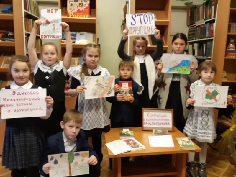 Проведен обзор книг для учащихся 2-9 классов, библиотекарь рассказала о том, что такое коррупция и какой вред она приносит человеку, познакомились с пословицами и поговорками, обличающими это явление, отметили участников конкурса рисунков «STOP коррупция», затем были предложены книги русских писателей, которые затрагивают тему коррупции.