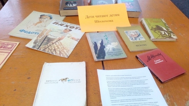 В рамках первого этапа марафона "Дети читают детям Шолохова" провели литературный час "Судьба человека - судьба писателя". Библиотекарь познакомила ребят с биографией и творчеством Михаила Шолохова. Прозвучали отрывки из таких произведений как "Судьба человека", "Нахаленок ", Федотка", Донские рассказы".