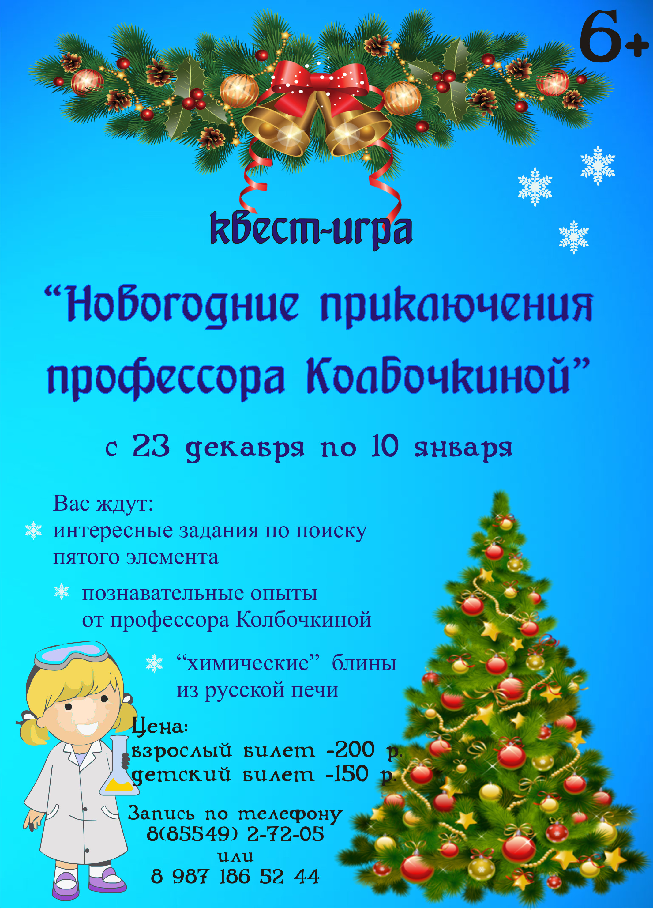 с 23 декабря по 10 января в Краеведческом музее будет проходить квест-игра "Новогодние приключения профессора Колбочкиной".