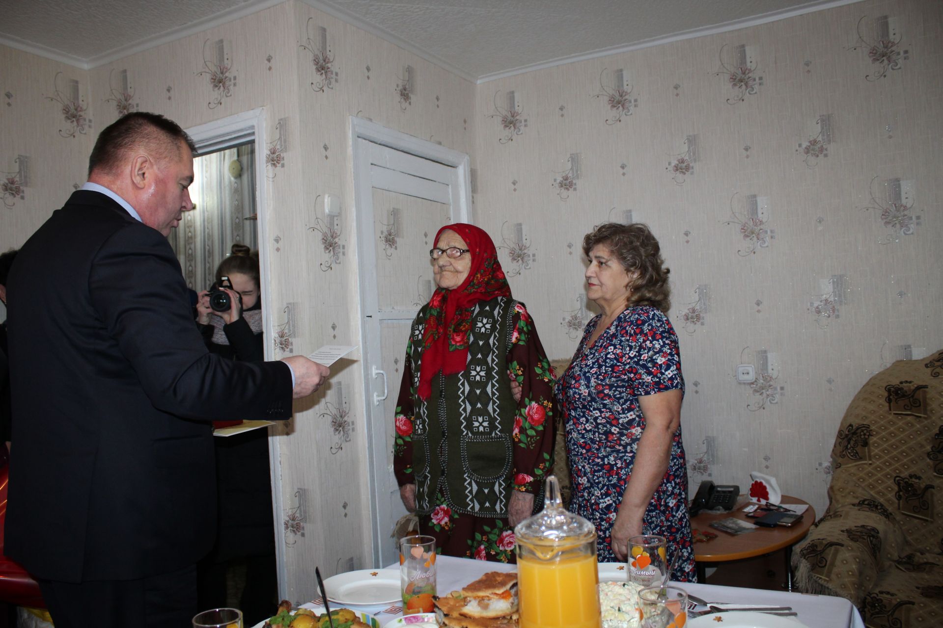 Ветерана с юбилеем поздравили глава Валерий Чершинцев, председатели Совета ветеранов района и завода, профкома химпредприятия, ТОС «Бондюжский» Любовь Сорокина, Татьяна Митшина, Рустем Бурганов и Рамзия Ахмадиева. А завтра за праздничным столом соберется большая семья — дети, девять внуков, 11 правнуков и два праправнука.