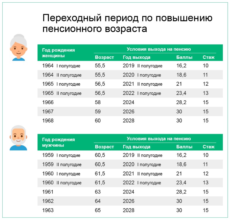 В 2020 году продолжают действовать правила переходного периода по увеличению возраста, дающего право на назначение пенсии по старости. Переход к новым параметрам происходит постепенно. Несмотря на то, что с 2020-го пенсионный возраст вырос еще на год, а общее увеличение составило уже два года, пенсии, как и в 2019 году, назначаются на шесть месяцев позже прежнего пенсионного возраста: в 55,5 лет женщинам и в 60,5 лет мужчинам. В течение двух лет действует льгота, которая распространяется на тех, кто должен был в соответствии с прежним законодательством выйти на пенсию в 2019 и 2020 годах. Так, женщины 1964 года рождения и мужчины 1959 года рождения в новых условиях выходили на пенсию во второй половине 2019-го и продолжают выходить в первой половине 2020 года - в зависимости от того, на какое полугодие приходится их день рождения. И в 2020 году женщины 1965 года рождения и мужчины 1960 года рождения за счет льготы достигнут пенсионного возраста только на полтора года позже – во вторую половину 2021-го, когда пенсионный возраст будет повышен уже на три года, и в первую половину 2022-го, когда пенсионный возраст станет выше на четыре года.