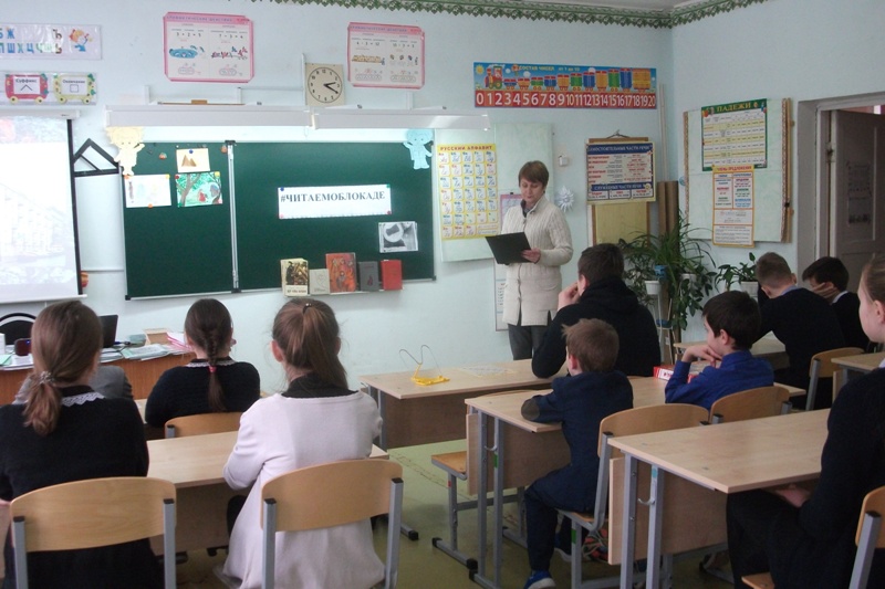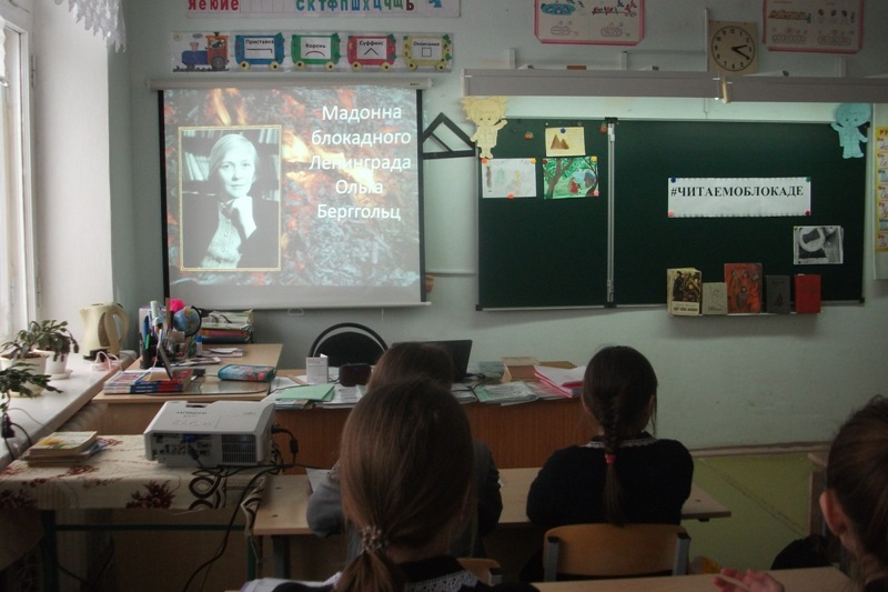 Библиотекарь Шишова Е. Б. подготовила для школьников презентацию, которая познакомила их с жизнью и творчеством Ольги Федоровны. Ребята услышали фонограмму голоса Берггольц. Ее голоса ждали измученные и голодные, но непокоренные ленинградцы. Ее голос стал голосом Ленинграда. Каждый день строго по графику она приходила в студию, и в эфир летели ожидаемые блокадниками слова: «Внимание! Говорит Ленинград! Слушай нас, родная страна. У микрофона поэтесса Ольга Берггольц». Именно она успокаивала и вдохновляла, отогревала души и сердца людей. Как сестра и мать, требовала быть сильнее страха смерти: живи, борись, побеждай. Во время блокады погибли около 1 млн. жителей, в том числе более 600 тыс. — от голода. Однако ни обстрелы и бомбардировки, ни голод и холод не сломили его защитников. Именно Берггольц принадлежат знаменитые слова: «Никто не забыт, и ничто не забыто».