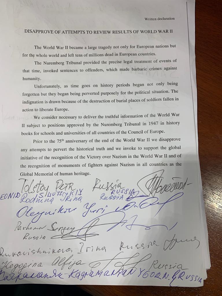 Российская делегация внесла в ПАСЕ проект декларации о недопустимости пересмотра истории Второй мировой войны, разрушения памятников и захоронений воинов, которые пали в боях против нацизма. На сегодняшний день свои подписи под декларацией поставили 77 депутатов из 17 национальных делегаций.