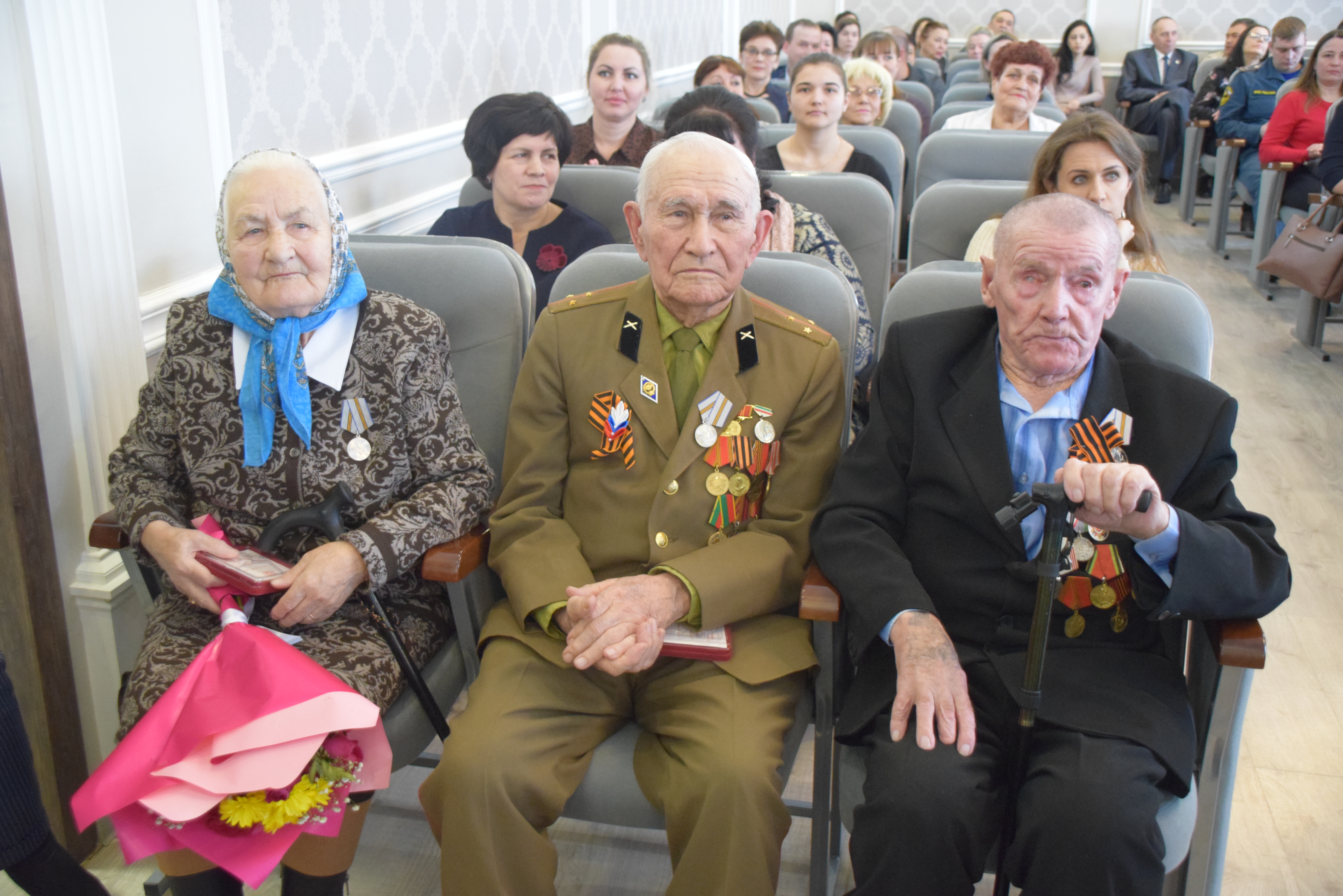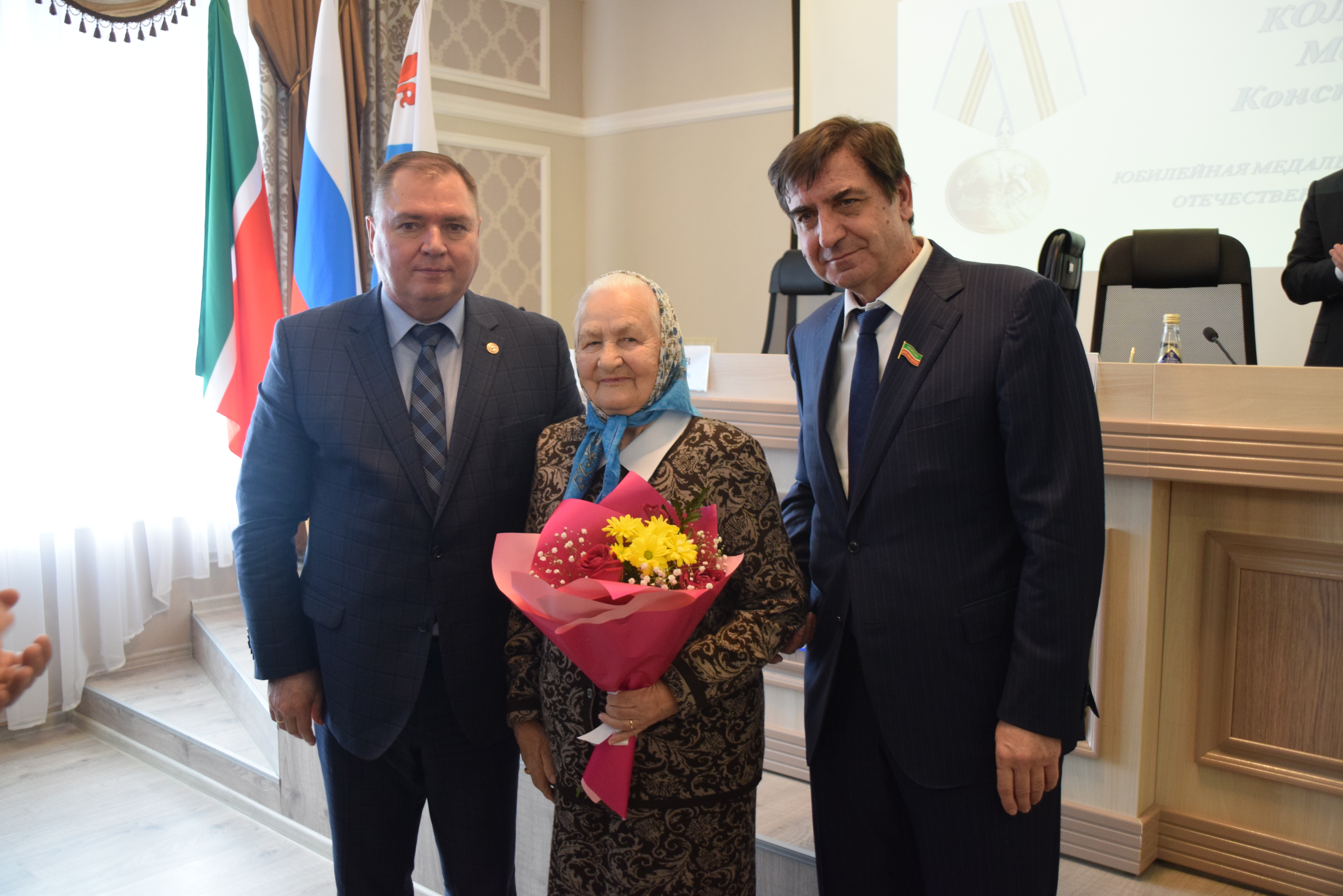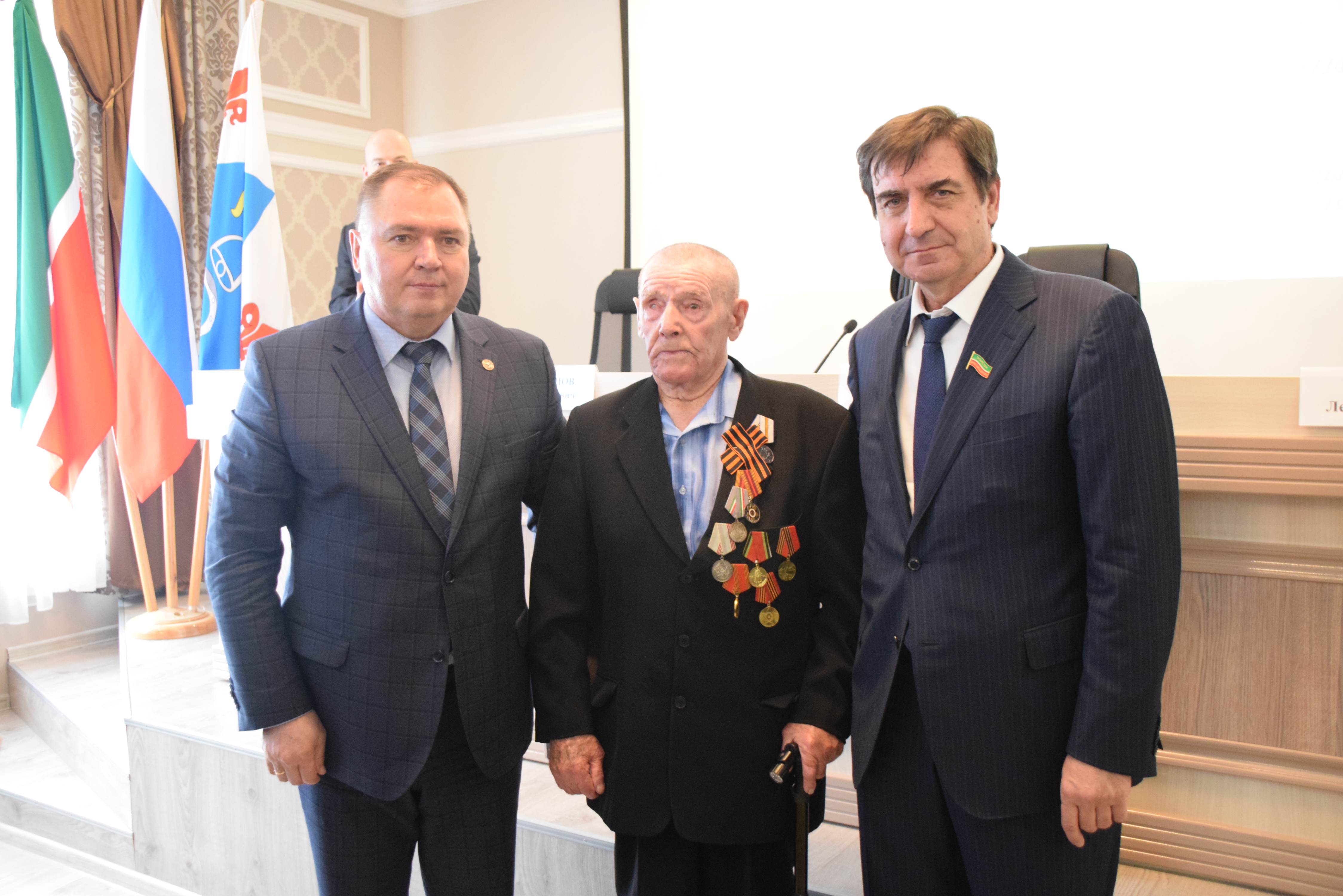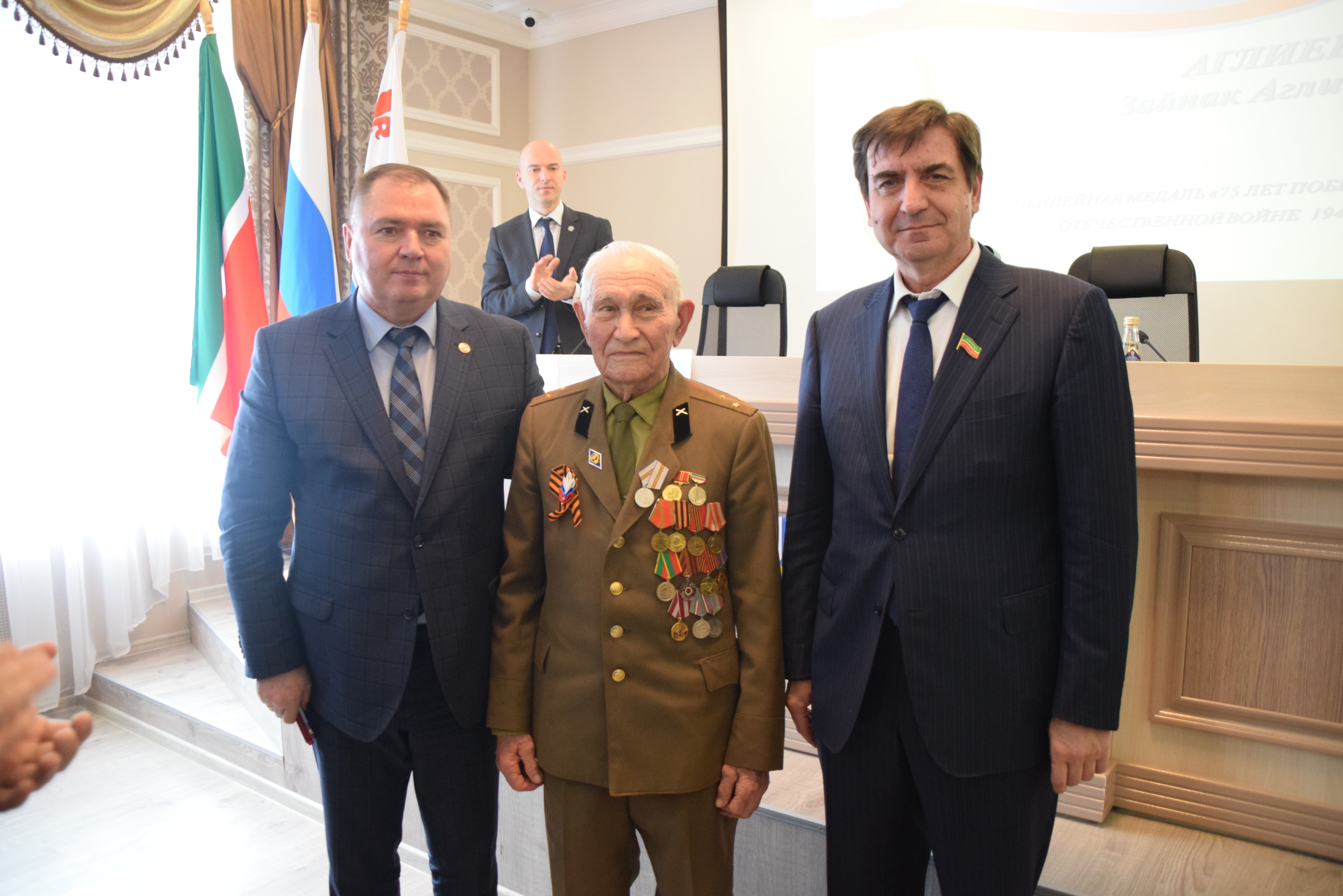 На заседании состоялось вручение юбилейных медалей 75-летия Победы в Великой Отечественной войне участникам ВОВ Зайнаку Аглиеву, Александру Попову и труженице тыла Маргарите Колобановой.