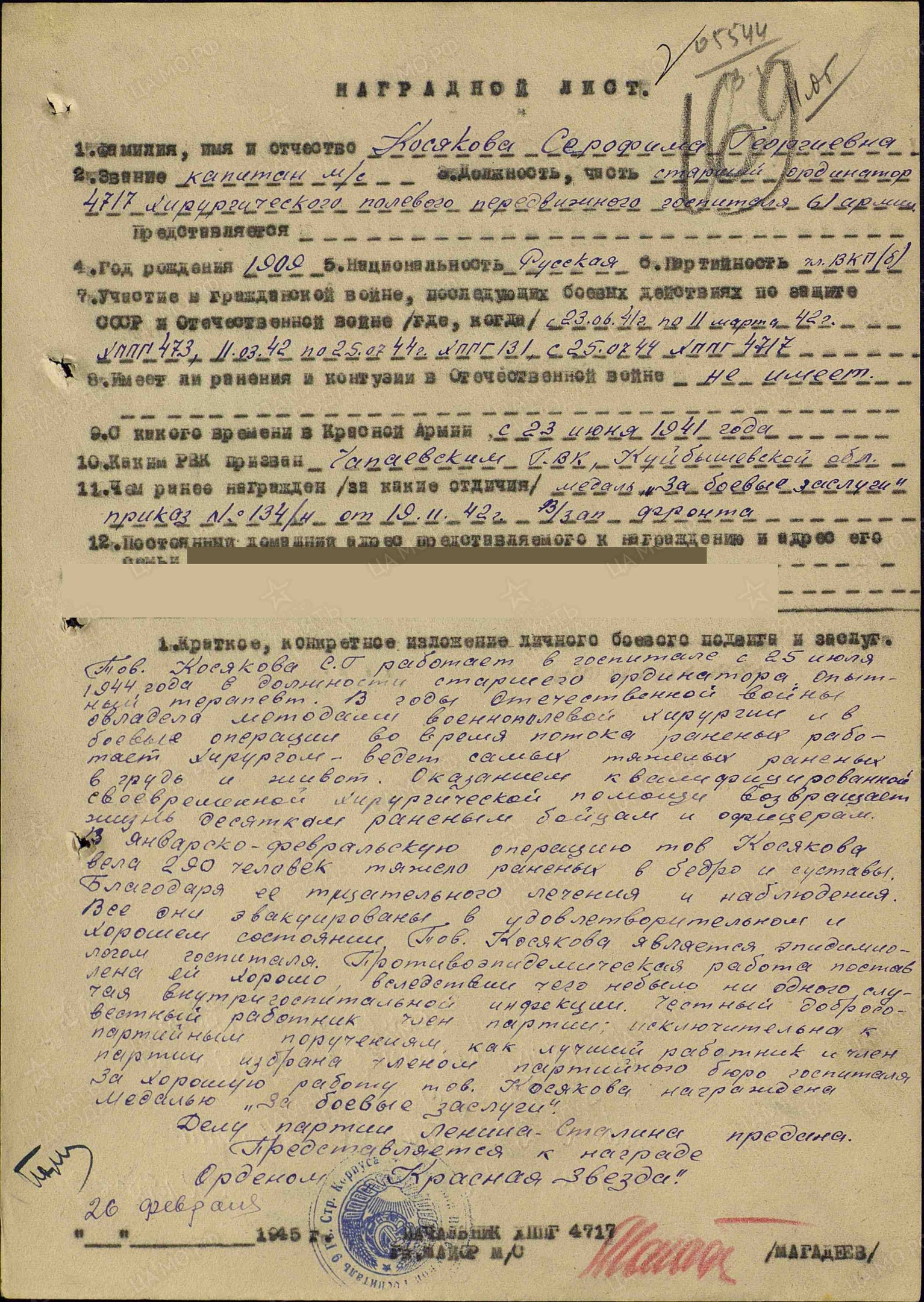 Косякова Серафима Георгиевна, уроженка Бондюжского района, д.Русский Сарсаз, капитан медслужбы, военврач третьего ранга. Во время войны освоила хирургию и специализировалась на лечении самых тяжелых раненых – в грудь, живот, бедро и суставы. Награждена 19.11.1942 г. медалью «За боевые заслуги», 14.05.1945 г. орденом Красной Звезды, орденом Отечественной войны II степени (1985 г.).