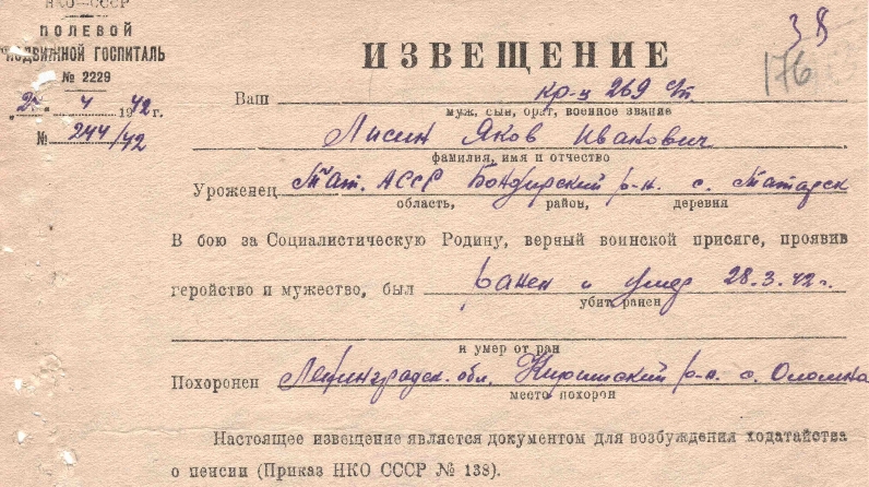 Похоронен в братской могиле в селе Оломна Киришского района Ленинградской области. светлую память о Якове Ивановиче бережно хранят внуки и правнуки.