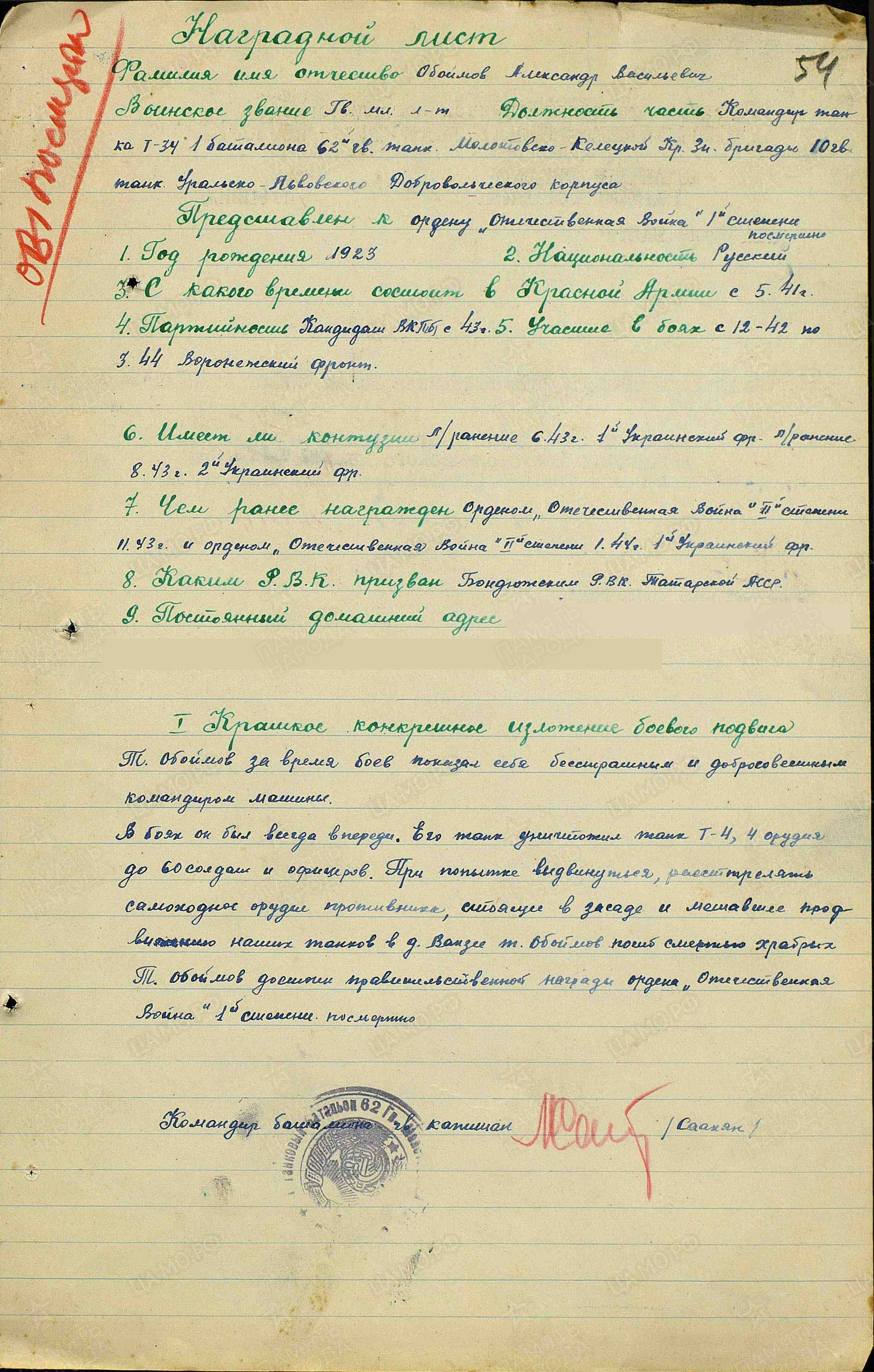 Александр Васильевич Обоймов родился в 1923 г., Бондюжский район ТАССР, д.Голодаево. Мобилизован Бондюжским районным военкоматом в 1941 г. Гвардии старший сержант, механик-водитель Т-34 152 танкового батальона 21 гвардейской танковой бригады 5 гвардейского танкового корпуса, Воронежский, Первый Украинский фронт. Гвардии младший лейтенант, командир танка Т-34 1 батальона 62 гвардейской танковой Молотовско-Келецкой Краснознаменной бригады 10 гвардейского танкового Уральско-Львовского добровольческого корпуса. Дважды ранен.