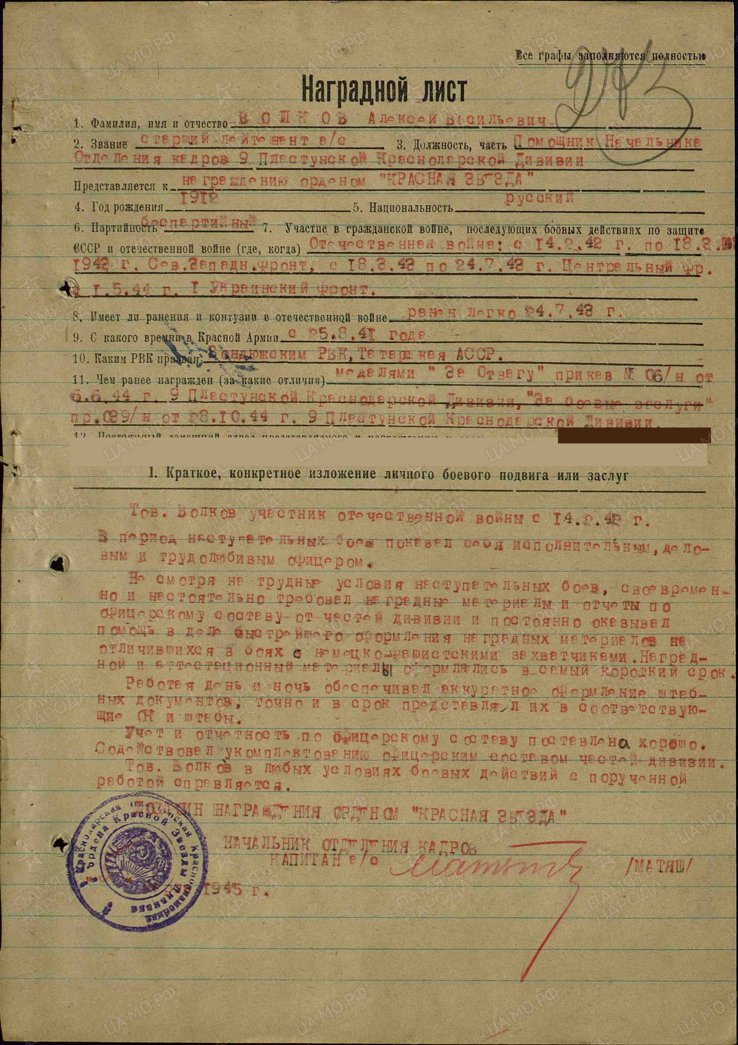 Во время Великой Отечественной войны название «пластунских» по традиции имели некоторые казачьи батальоны, полки и 9-я пластунская стрелковая дивизия, в которой и служил Алексей Васильевич. Он родился в 1912 году. Трудовую деятельность начал на Бондюжском химзаводе. В армию призван в августе 1941 года Бондюжским райвоенкоматом.