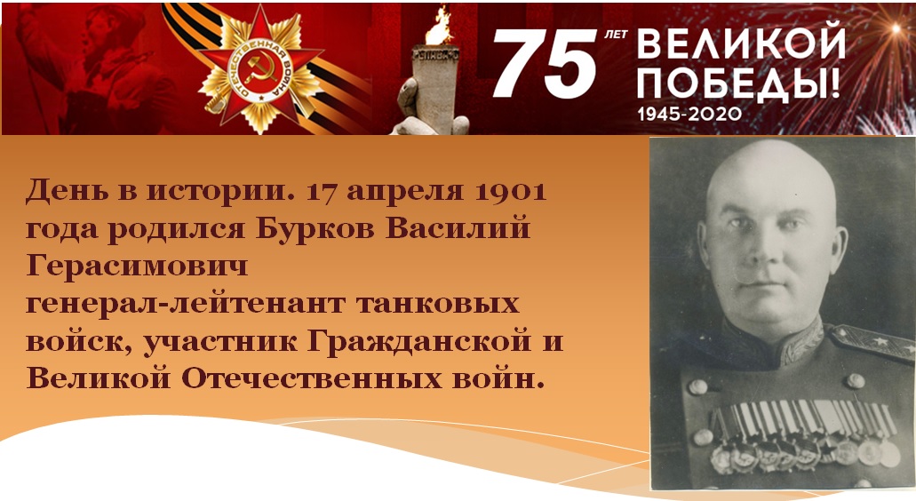 Бурков Василий Герасимович (17.04.1901 г., с.Кураково ныне Менделеевского района ТАССР – 13.12.1957 г., г.Ленинград) советский военачальник, генерал-лейтенант танковых войск, участник Гражданской и Великой Отечественных войн.