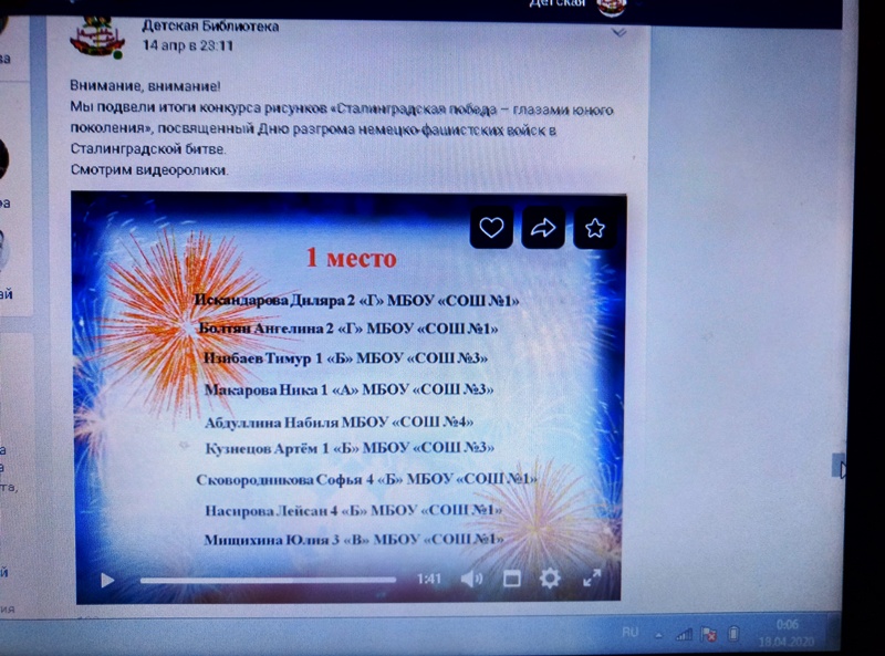 На конкурс было представлено более 40 рисунков. Жюри просмотрело, и отобрали победителей. В связи с карантином награждение победителей перенесено на более поздний срок. Итоги конкурса были сделаны в видео ролика и размещены на странице в контакте Детская библиотека.