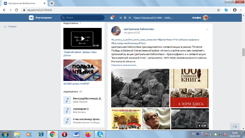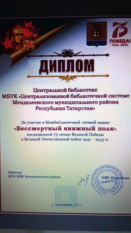 Центральная библиотека присоединяется к сетевой акции в рамках 75-летия Победы в Великой Отечественной войне «И книгу о войне кино нам оживляет», организатор акции Центральная библиотека г. Красноуфимск и к сетевой акции "Бессмертный книжный полк", организатор - МУК МЦБ Зимовниковского района Ростовской области.