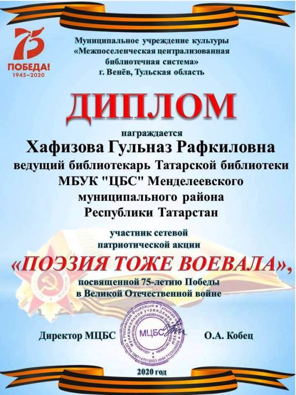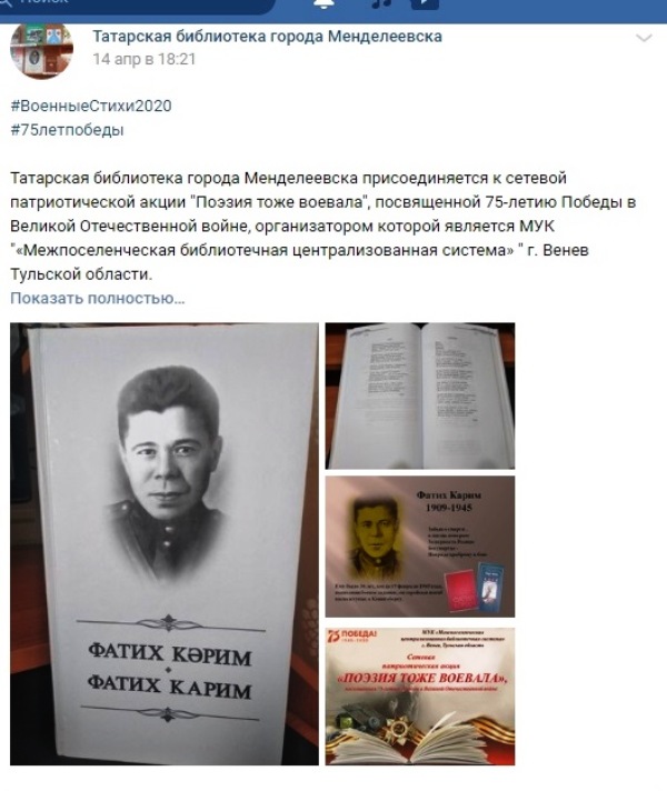 Татарская библиотека города Менделеевска присоединилась к сетевой патриотической акции "Поэзия тоже воевала", посвященной 75-летию Победы в Великой Отечественной войне, организатором которой является МУК «Межпоселенческая библиотечная централизованная система» г. Венев Тульской области.