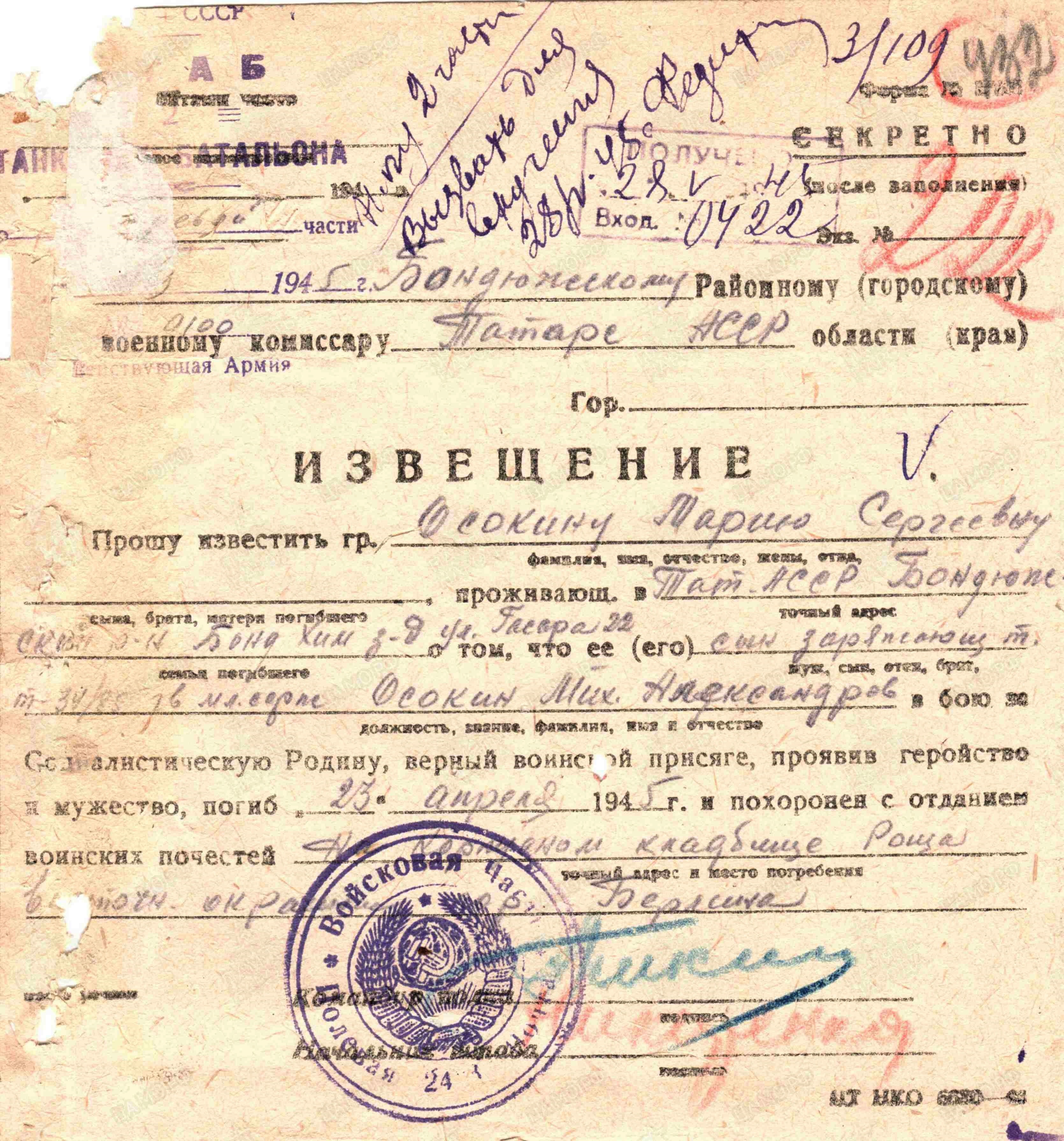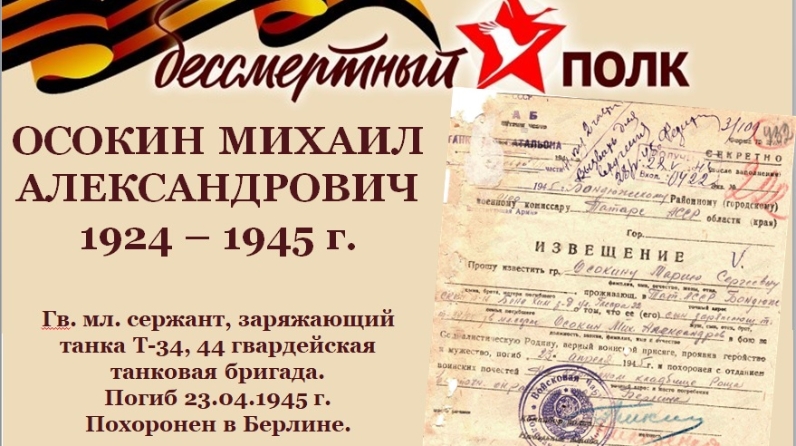 75 лет назад на территории Германии, на подступах к Берлину, шли самые ожесточенные бои. Сотни фронтовиков, прошедших всю войну, выжившие в самых страшных сражениях, погибали за несколько дней до Великой Победы. Один из них 21-летний Миша Осокин. Он погиб 23 апреля 1945 года.