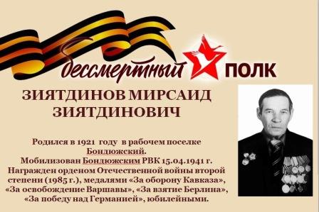 Мирсаид Зиятдинович родился в 1921 году в рабочем поселке Бондюжский. Трудовую деятельность начал в 1936 году на Бондюжском химзаводе рабочим. Мобилизован Бондюжским РВК 15.04.1941г. Воевал на Первом Украинском фронте, в автомобильном батальоне, рядовой.
