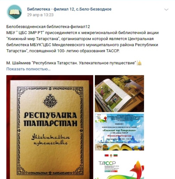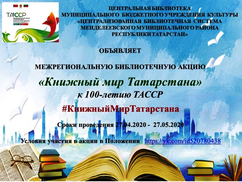 В рамках 100-летия ТАССР Центральная библиотека организовала межрегиональную библиотечную акцию «Книжный мир Татарстана», которая способствует популяризации лучших образцов литературы Татарстана и объединению усилий библиотек в поддержке продвижения чтения.