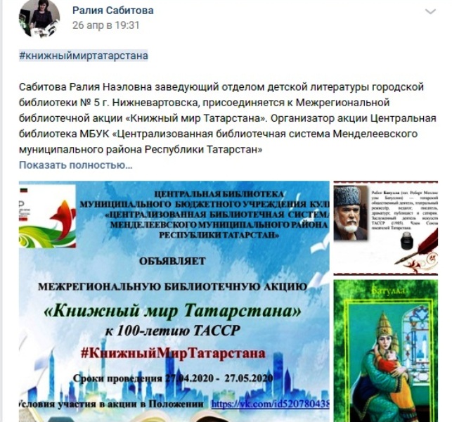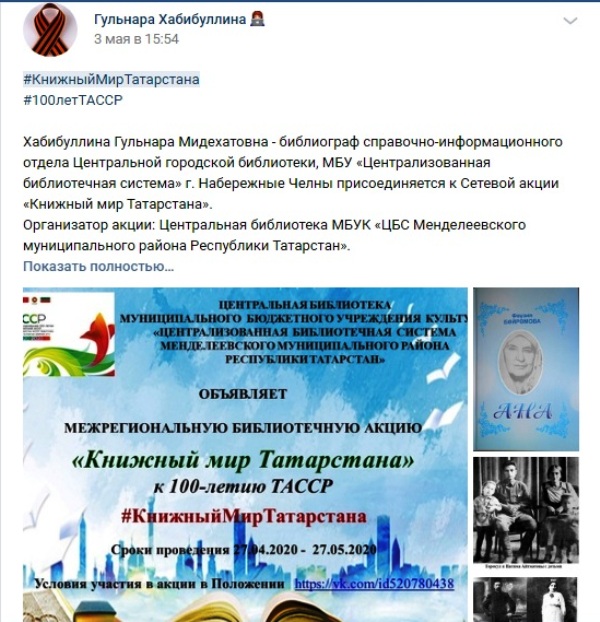 Благодаря этой акции Центральная библиотека Менделеевска стала узнаваема, у нее появилось много подписчиков и друзей в социальных сетях. Акция продолжится до 27 мая, надеемся, что участников станет еще больше, расширится ее география и будет представлено еще много замечательных книг.