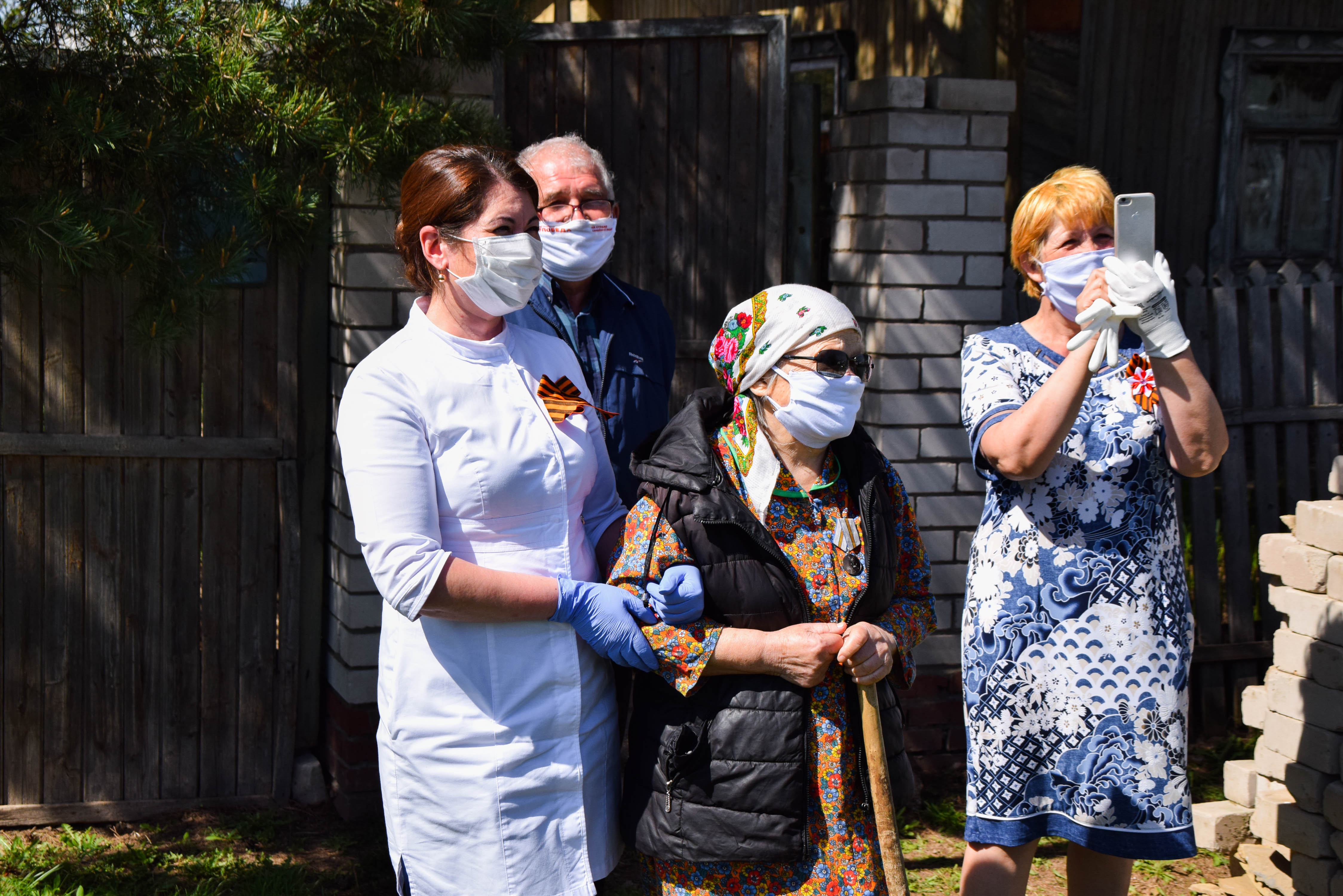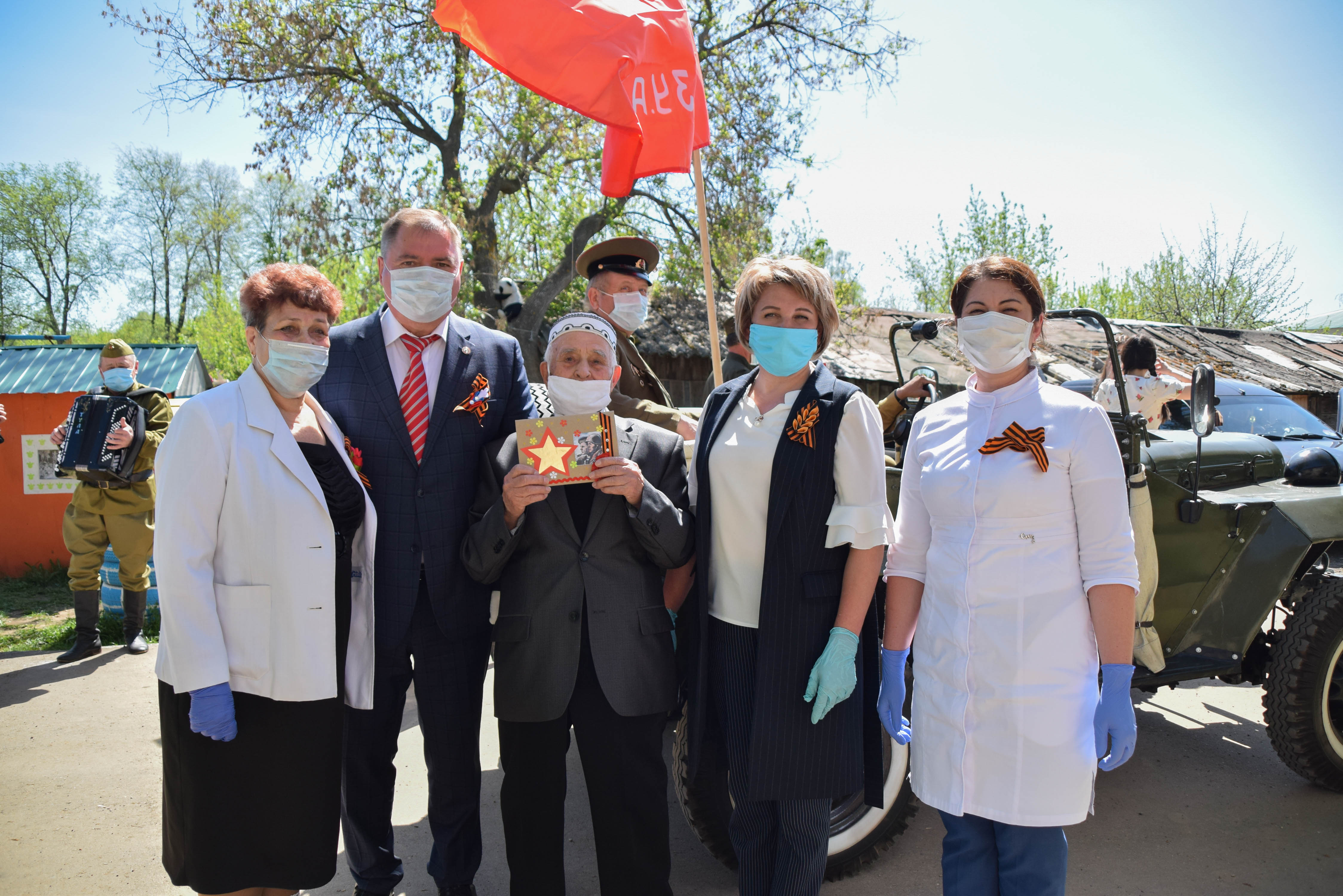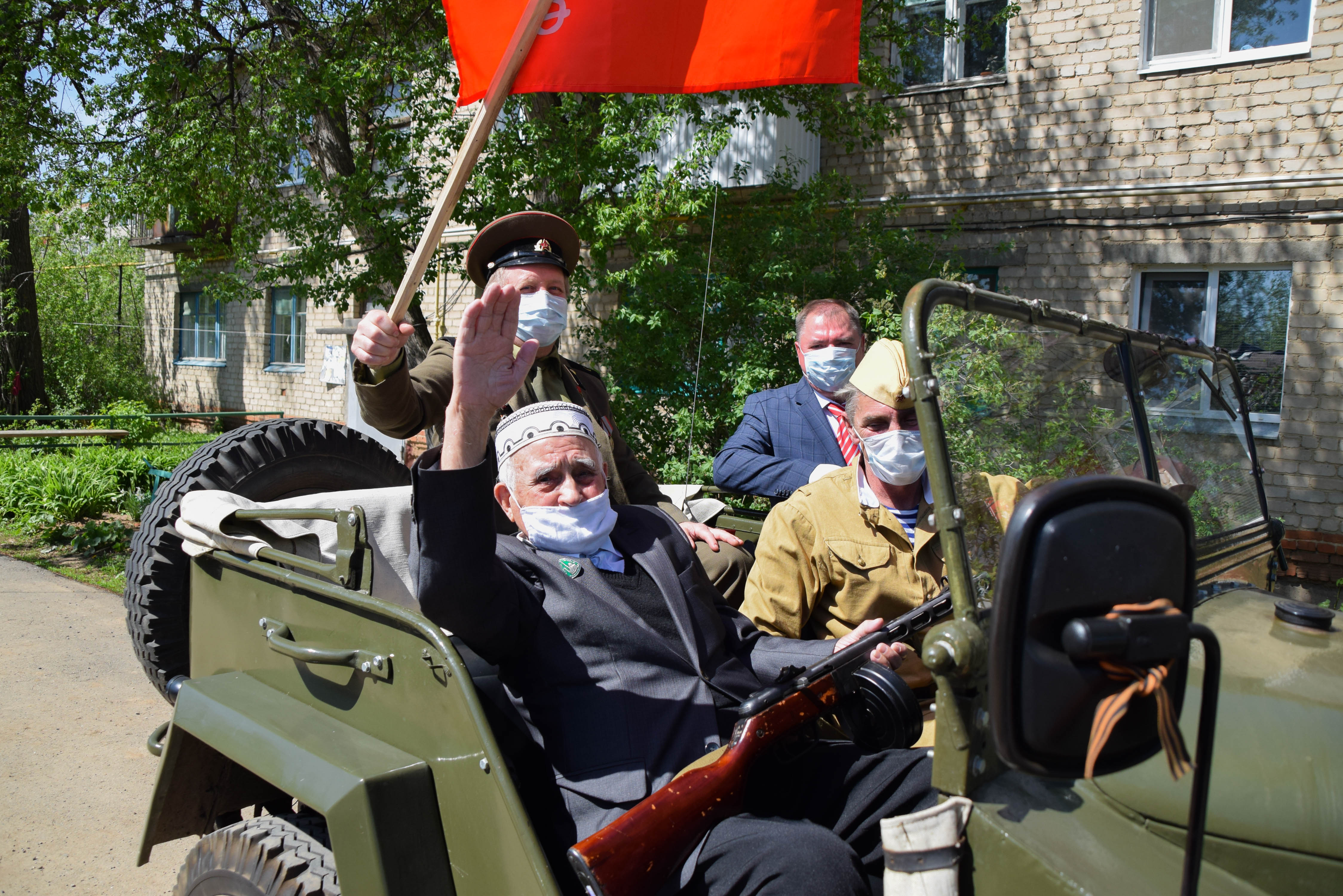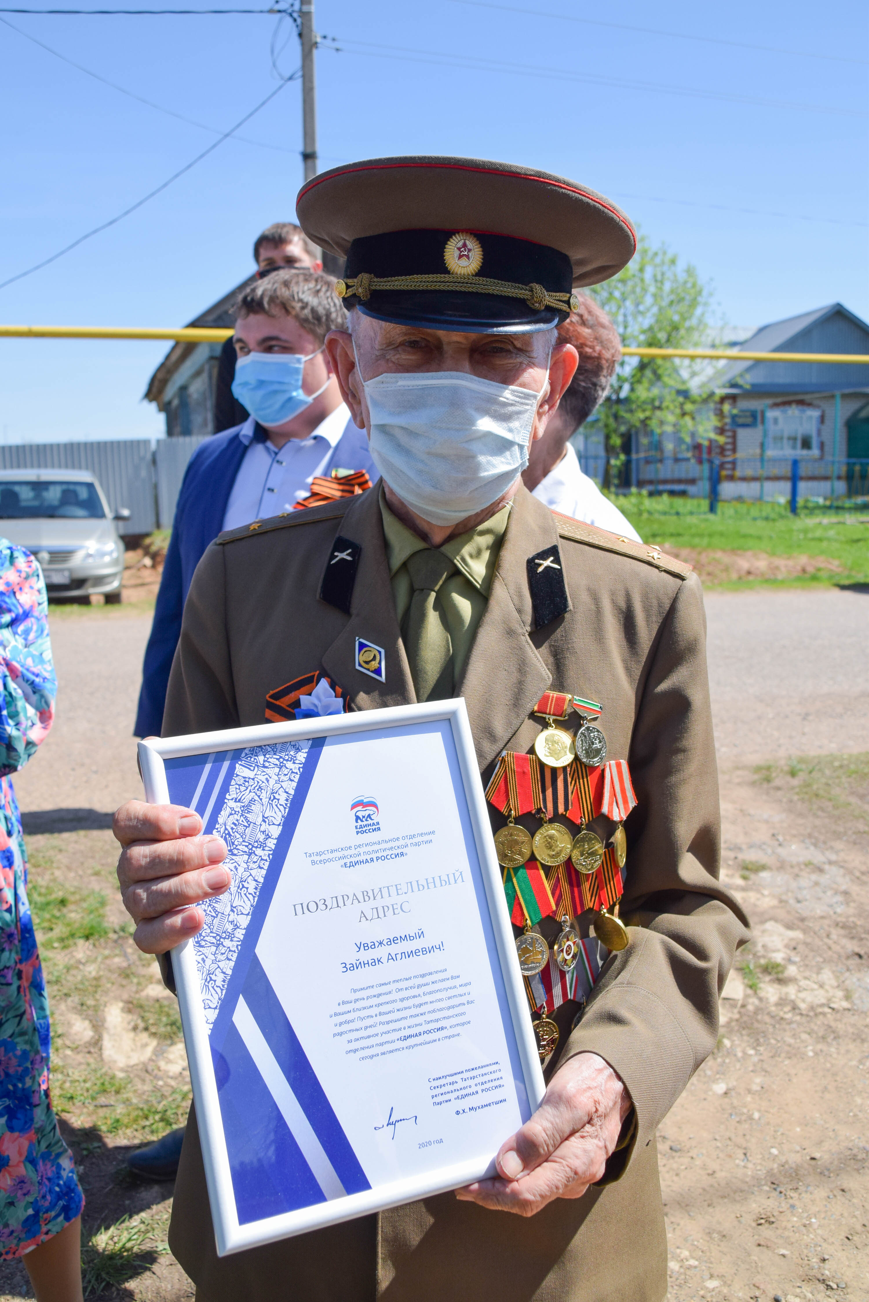 Для наших героев было подготовлено необычное поздравление. Глава района подъезжал к каждому на военной машине, далее артисты исполняли песни военных лет, танцевали, играли на баяне. Ветеранам вручили поздравительные открытки, продуктовые наборы от имени Главы района и компании Татнефть.