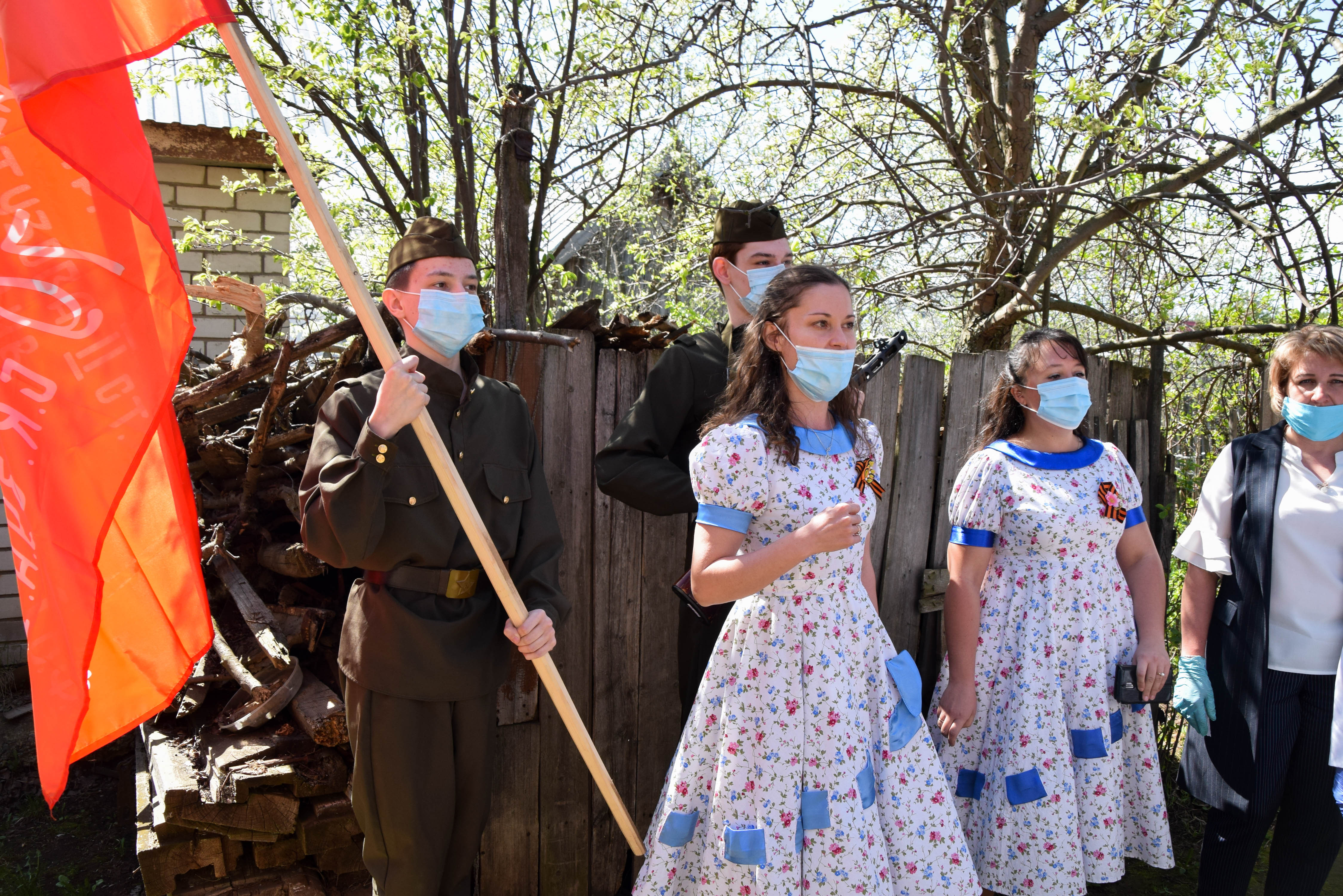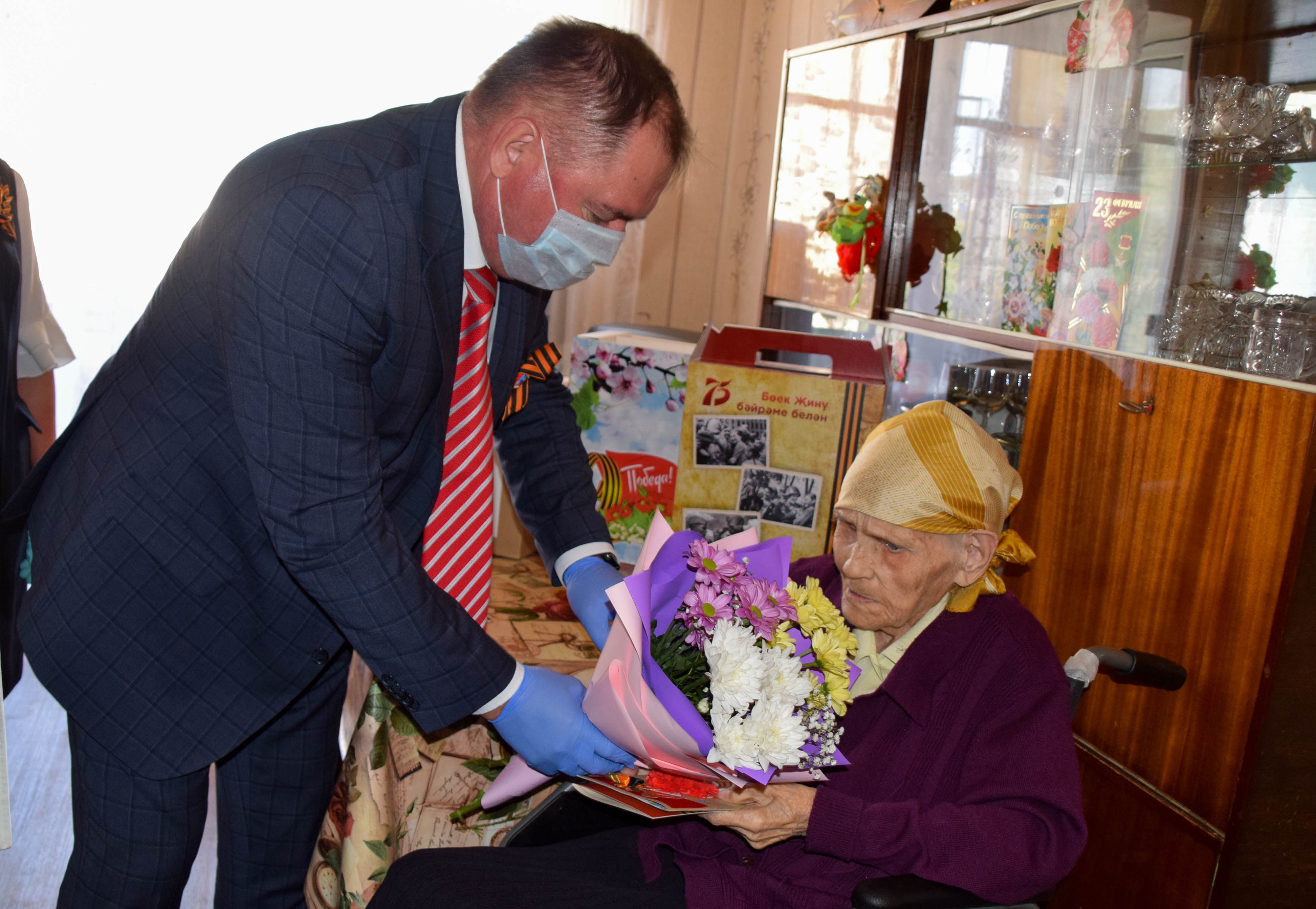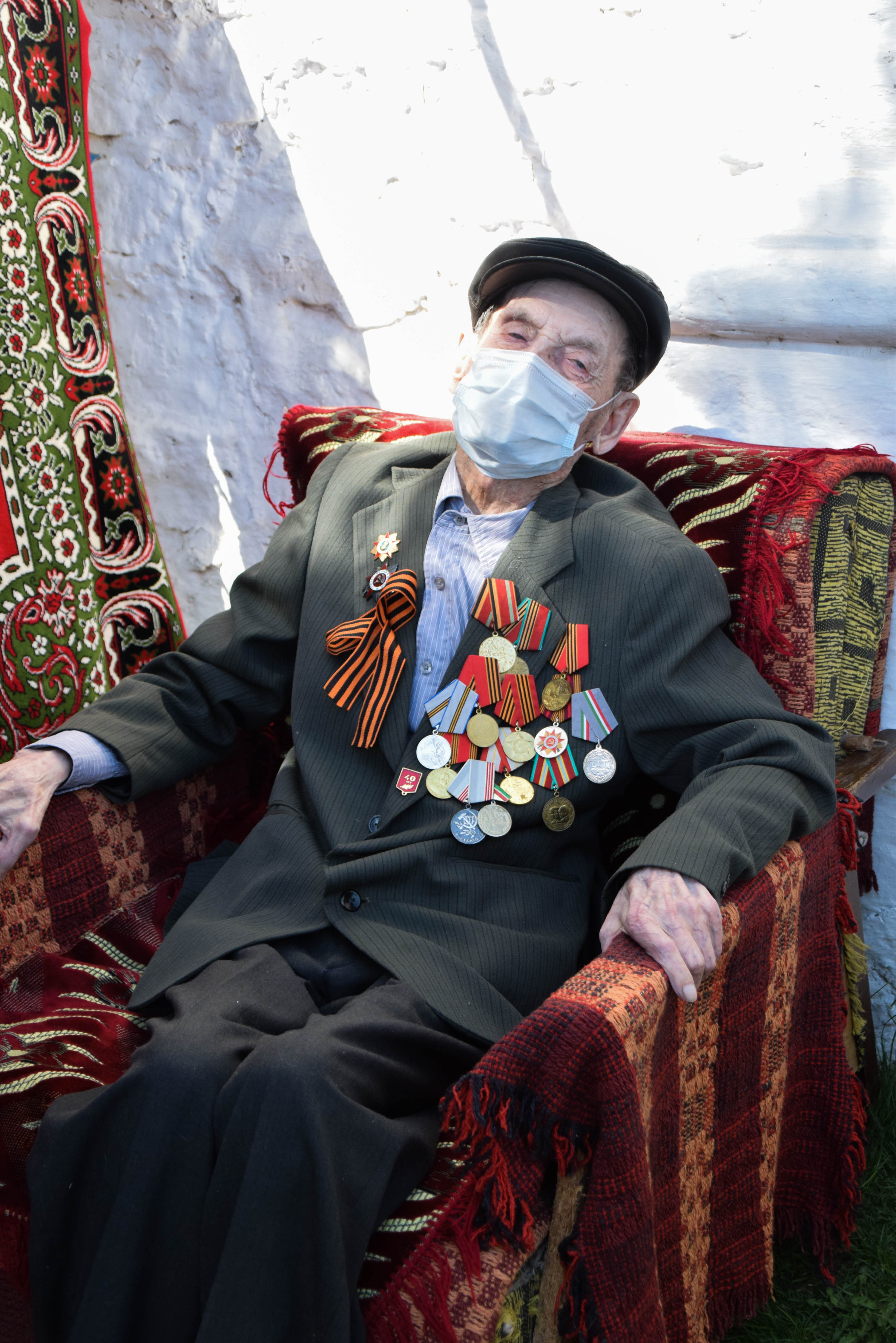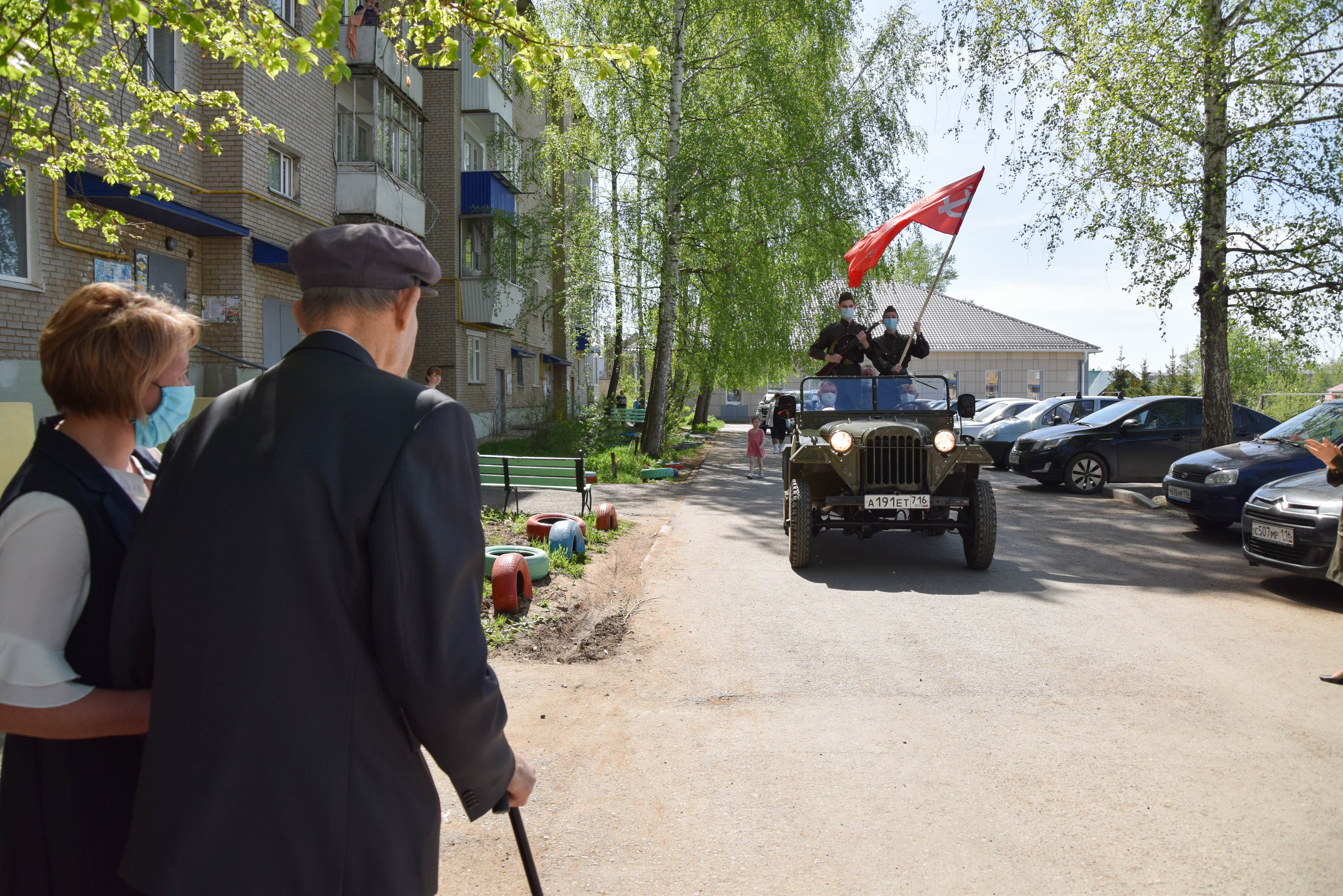 Для наших героев было подготовлено необычное поздравление. Глава района подъезжал к каждому на военной машине, далее артисты исполняли песни военных лет, танцевали, играли на баяне. Ветеранам вручили поздравительные открытки, продуктовые наборы от имени Главы района и компании Татнефть.