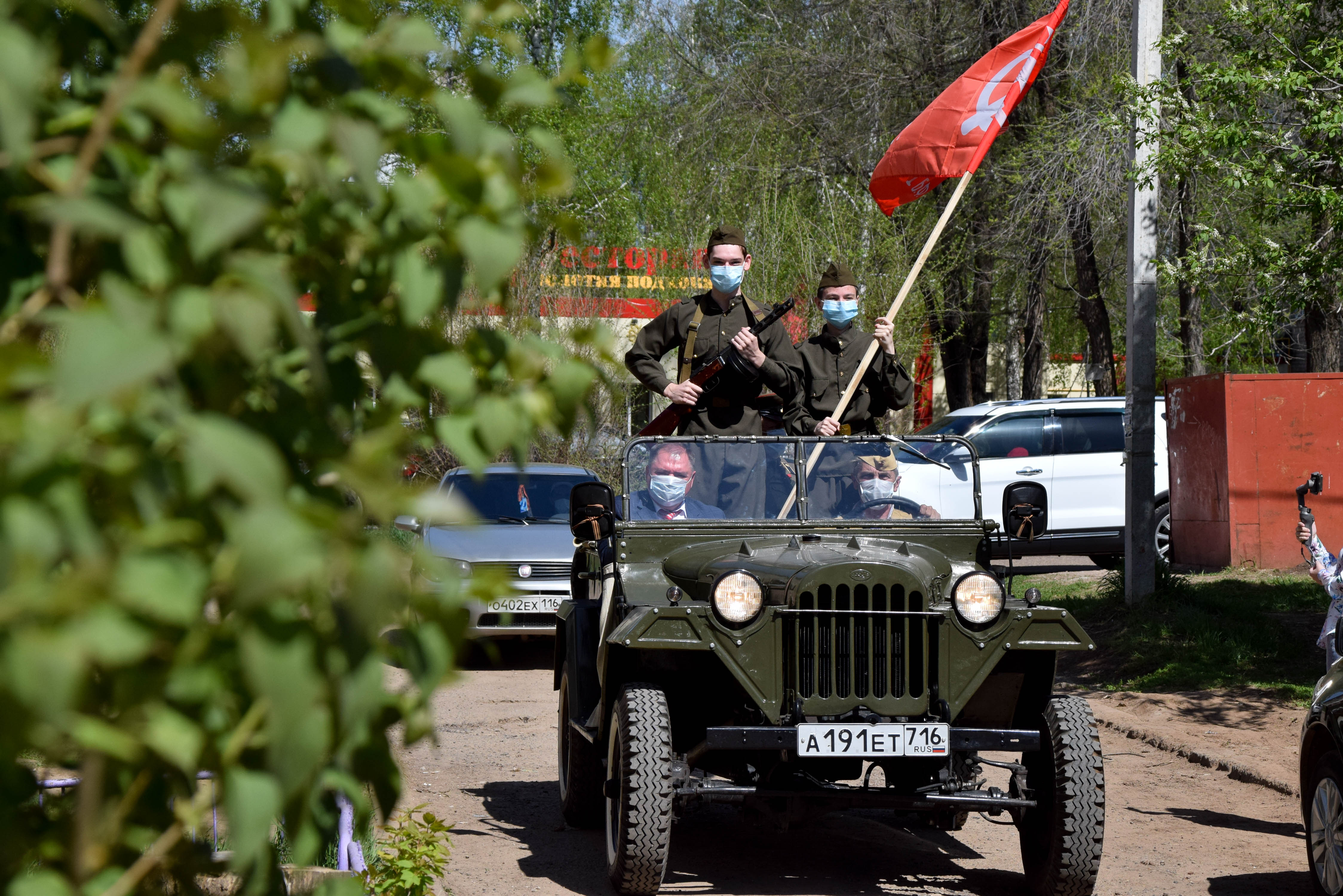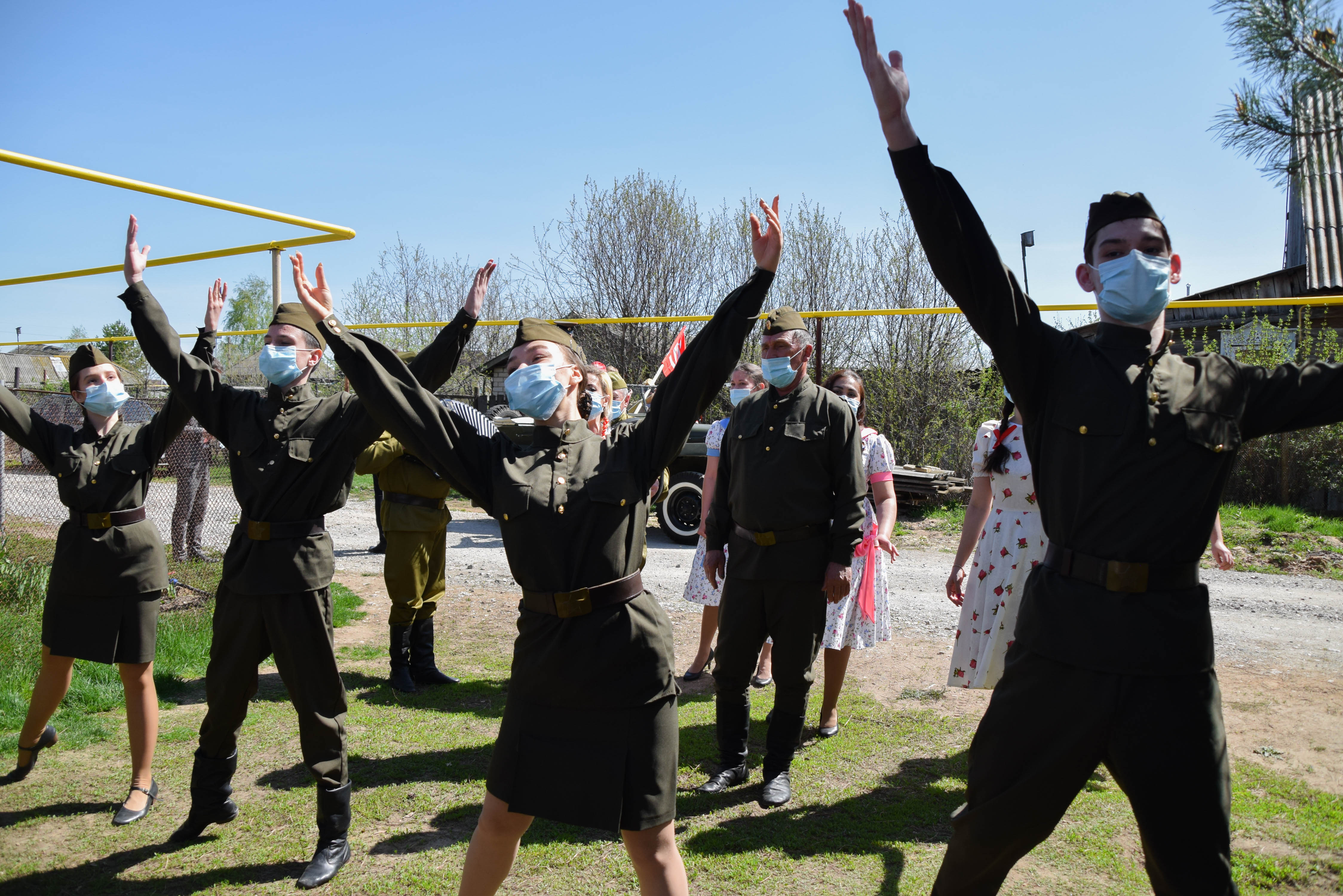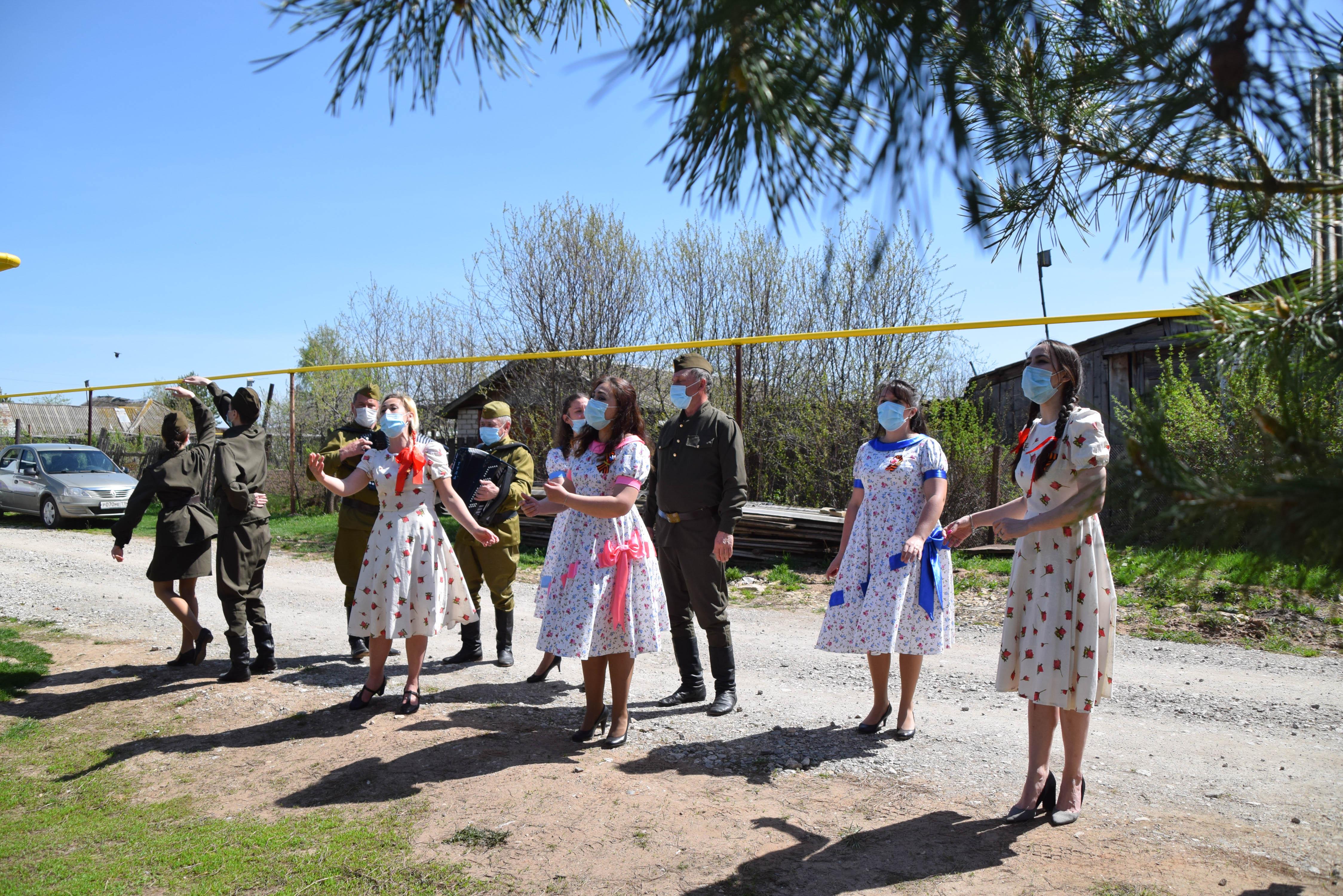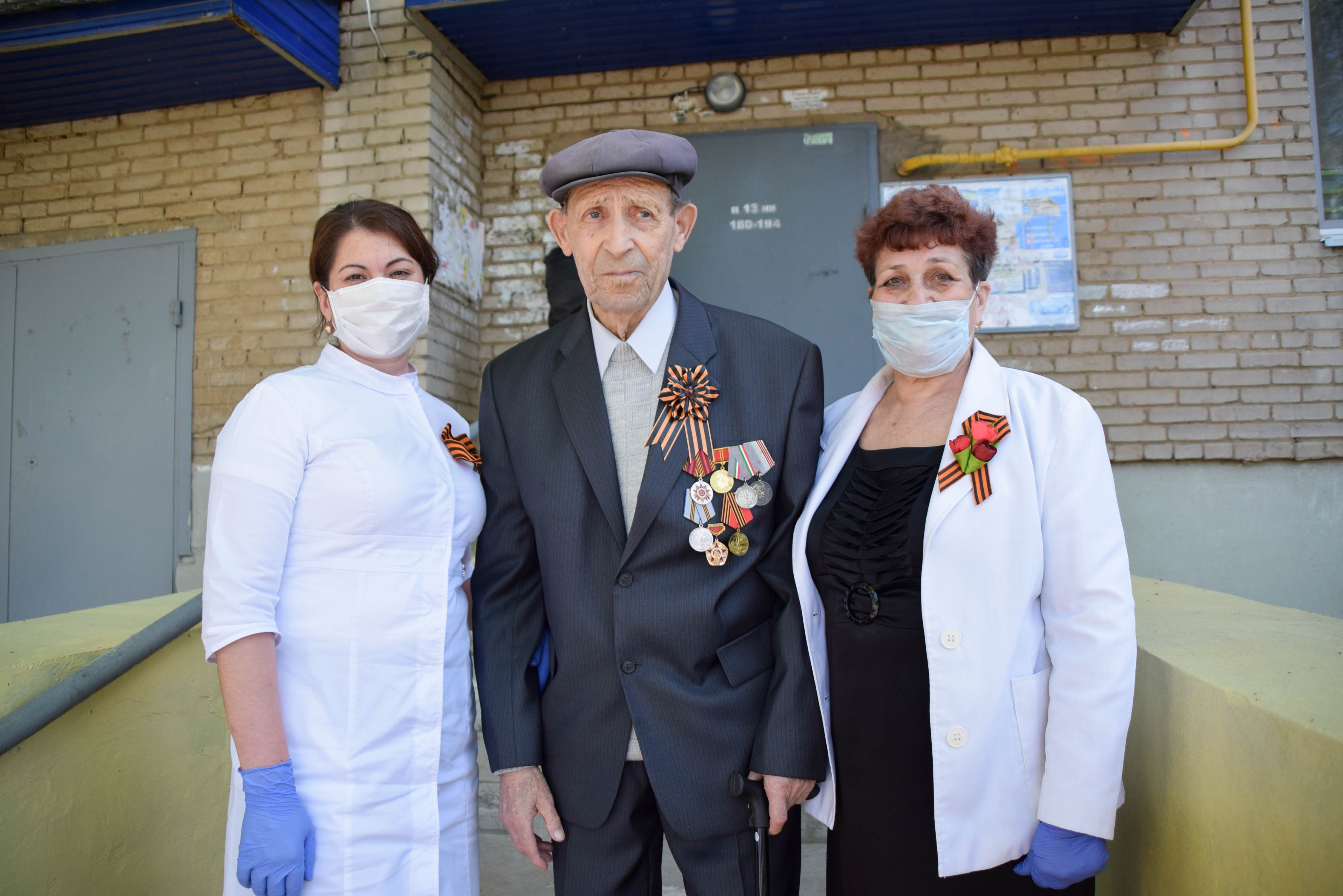 Для наших героев было подготовлено необычное поздравление. Глава района подъезжал к каждому на военной машине, далее артисты исполняли песни военных лет, танцевали, играли на баяне. Ветеранам вручили поздравительные открытки, продуктовые наборы от имени Главы района и компании Татнефть.
