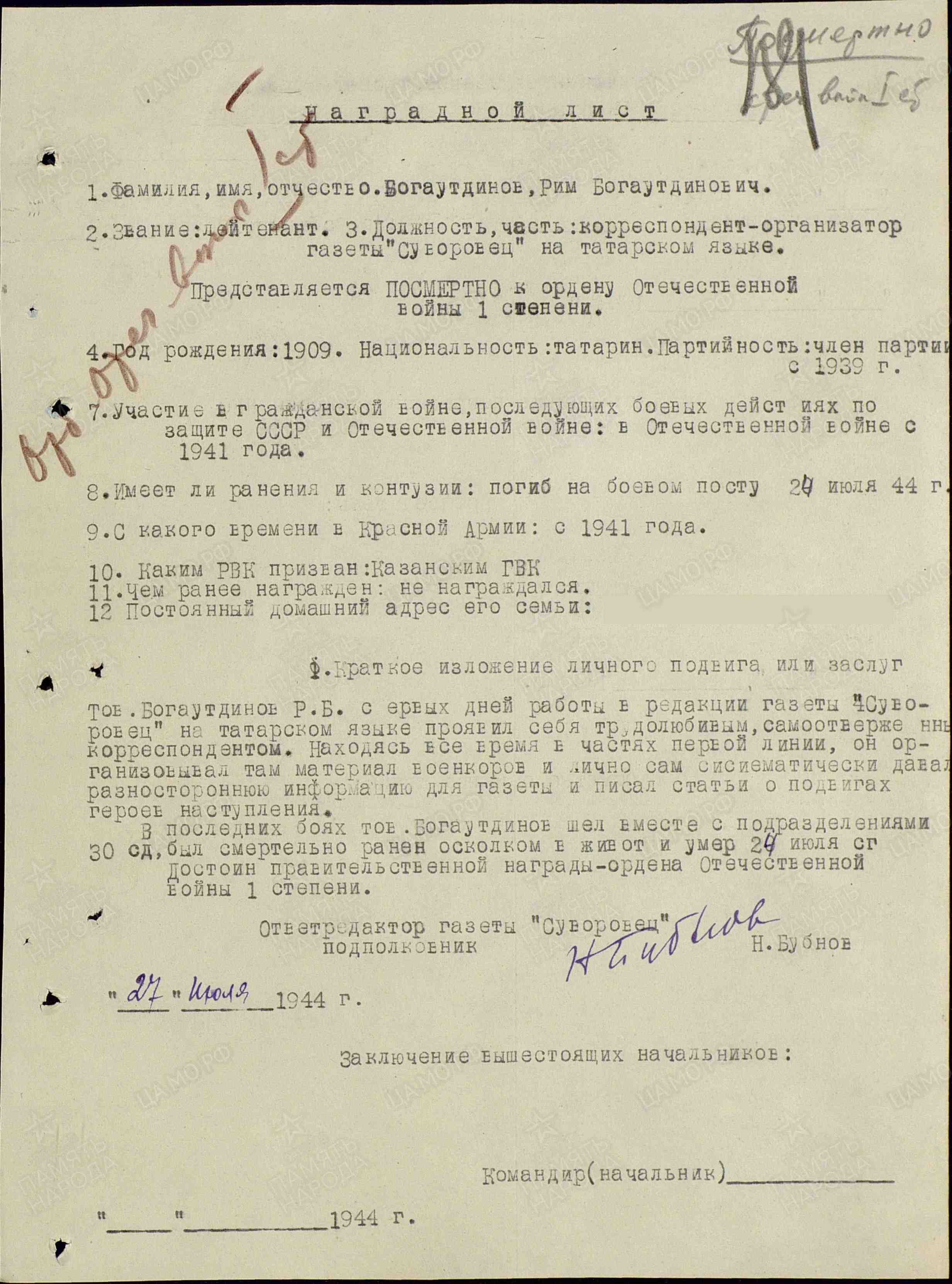 Спустя полгода погибнет и автор очерка. Посмертно он награжден орденом Отечественной войны I степени. Из наградного листа: «Тов. Богаутдинов с первых дней работы в редакции газеты «Суворовец» на татарском языке проявил себя трудолюбивым, самоотверженным корреспондентом. Находясь все время в частях первой линии, он организовывал там материал военкоров и лично систематически давал разностороннюю информацию для газеты и писал статьи о подвигах героев наступления. В последних боях тов. Богаутдинов шел вместе с подразделениями 30 стрелковой дивизии, был смертельно ранен осколком в живот и умер 24 июля 1944 г. Достоин правительственной награды ордена Отечественной войны I степени».