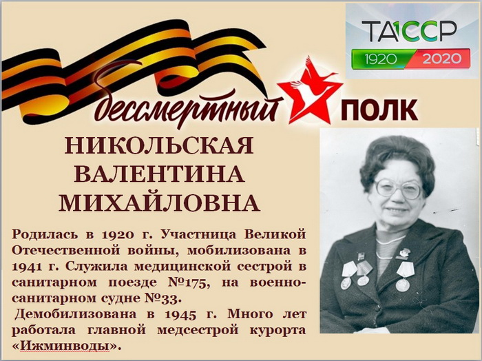 Родилась Валентина Михайловна в 1920 году. Участница Великой Отечественной войны, мобилизована в 1941 году. Служила медицинской сестрой в санитарном поезде №175, на военно-санитарном судне №33. Демобилизована в 1945 г. В мирное время продолжила служить людям, медицине. Работала санитарным врачом Казанского треста столовых, много лет была главной медсестрой курорта «Ижминводы». Многие молодые специалисты нашли в ее лице мудрого наставника, получив под руководством Валентины Михайловны бесценный профессиональный опыт.