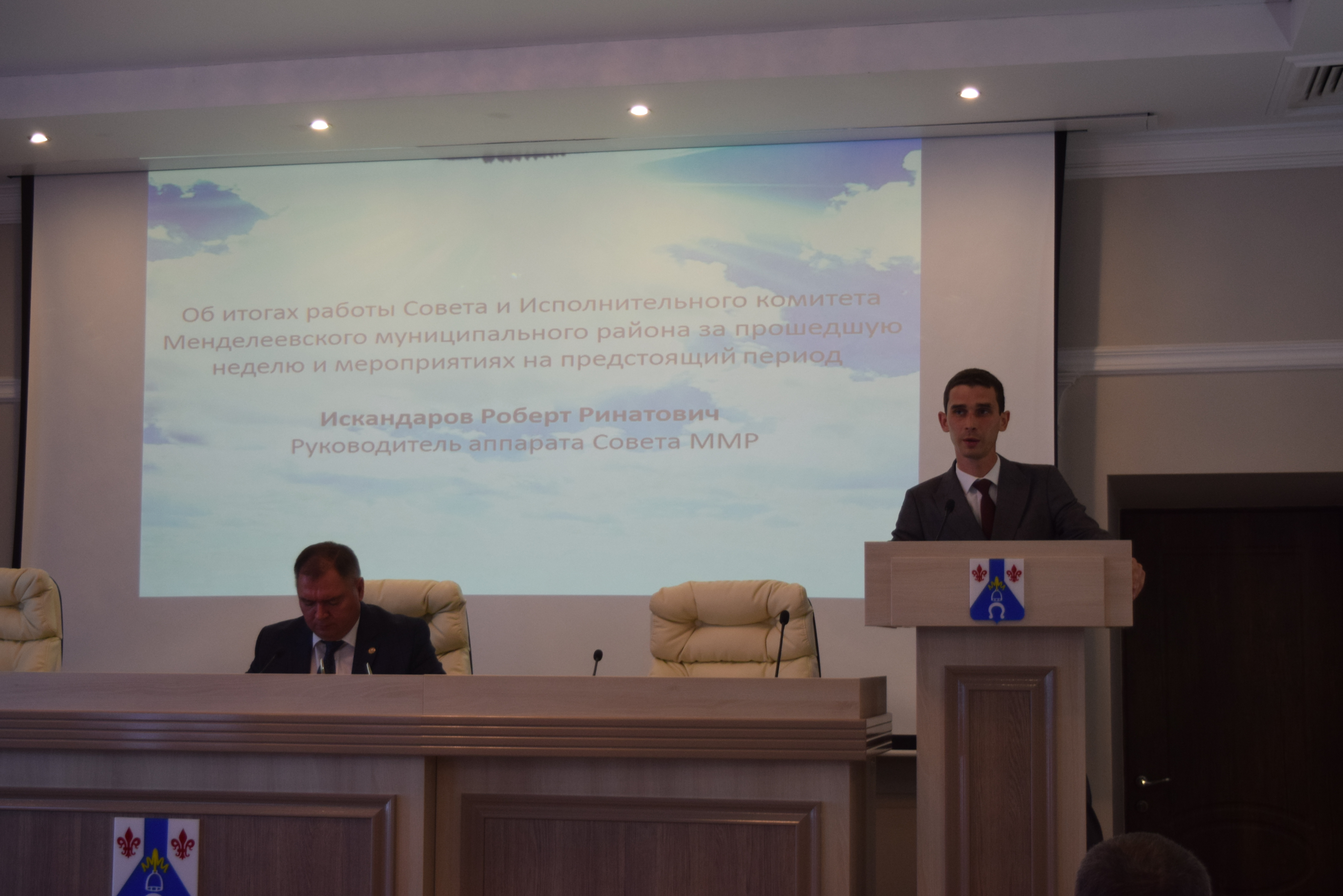 Об итогах работы Совета и Исполнительного комитета Менделеевского муниципального района за прошедшую неделю и мероприятиях на предстоящий период доложил Искандаров Роберт Ринатович – руководитель аппарата Совета ММР.