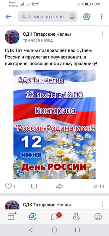 Так в группе WhatsApp была размещена музыкальная мозаика «У моей России длинные косички». В ВК прошла викторина «Россия – Родина моя!». Ярко прошла акция «Российский триколор». Работники в национальных костюмах поздравляли жителей села с праздником и вручали ленточки.