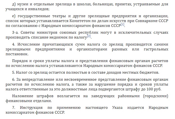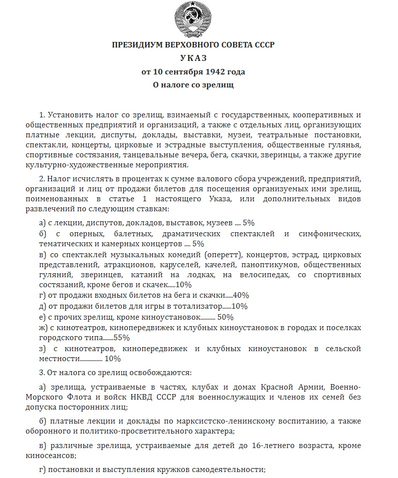 Указом Президиума ВС СССР от 10 сентября 1942 г. введен единый налог со зрелищ, который уплачивали государственные, кооперативные и общественные предприятия и организации по дифференцированным ставкам в процентах с валовой выручки от проведения платных киносеансов, цирковых представлений, спортивных состязаний.