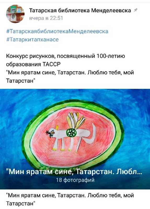 Завершился конкурс рисунков “Мин яратам сине, Татарстан. Люблю тебя, мой Татарстан”, посвященный к 100-летию образования ТАССР, которую организовала Татарская библиотека г.Менделеевска.