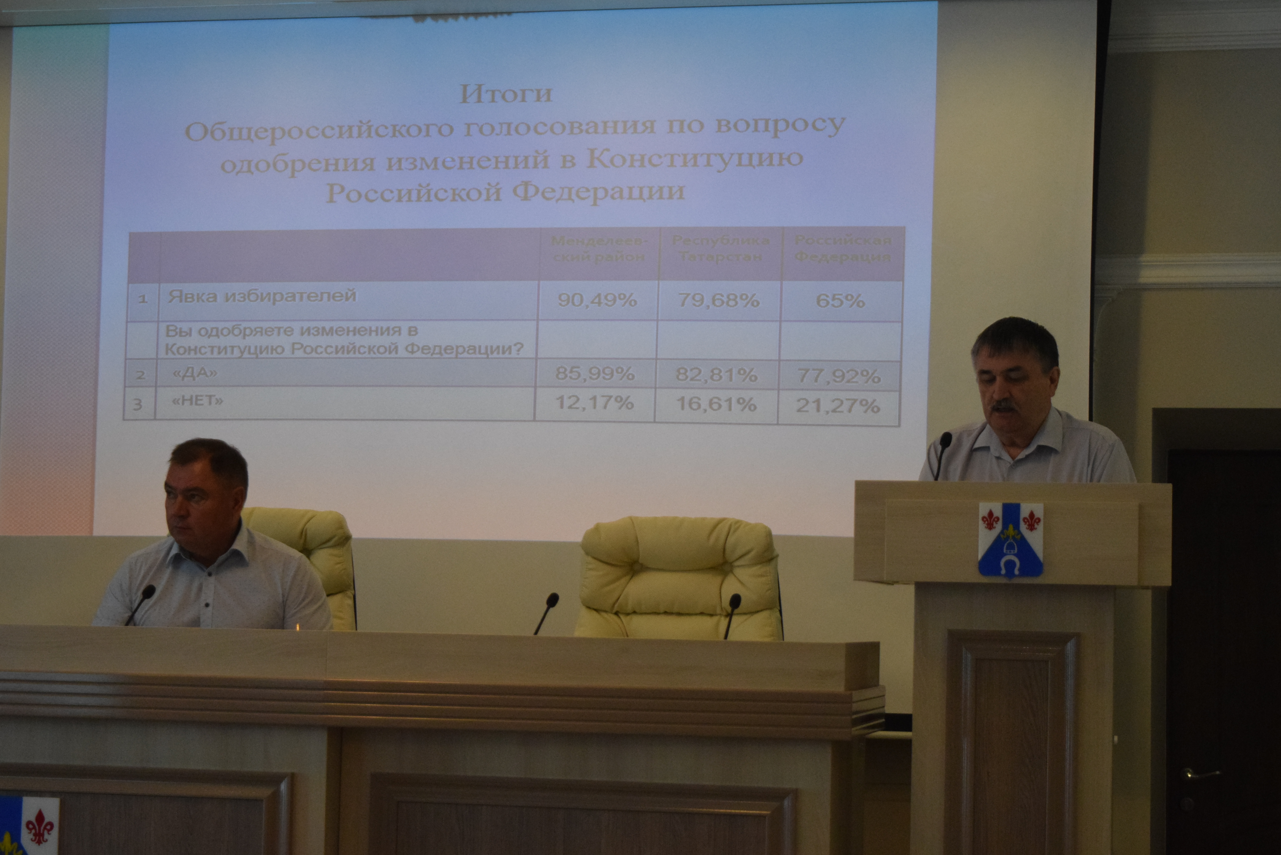 Миронов Павел Степанович – председатель Территориально-избирательной комиссии - сообщил об итогах проведения общероссийского голосования по вопросу одобрения изменений в Конституцию Российской Федерации в ММР. Напомним, что явка в Менделеевском районе составила 90,49%. 85,99% из проголосовавших поддержали поправки в Конституцию РФ.