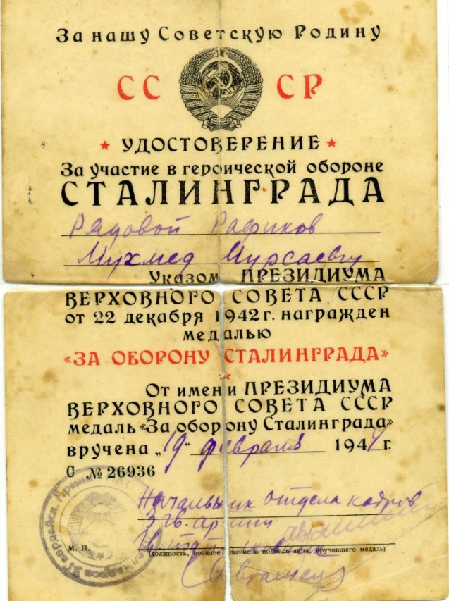 На снимке: удостоверение Рафикова М.М., участника Сталинградской битвы, из фондов краеведческого музея г.Менделеевска.