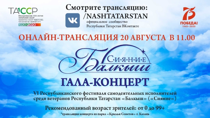 20 августа 2020 года в 11:00 в формате онлайн-трансляции на странице официального сообщества Республики Татарстан в социальной сети "ВКонтакте" ( https://vk.com/nashtatarstan ) состоится гала-концерт лауреатов VI Республиканского фестиваля самодеятельных исполнителей среди ветеранов "Балкыш" ("Сияние"), посвященный 75-й годовщине Победы советского народа в Великой Отечественной войне и 100-летию образования ТАССР.