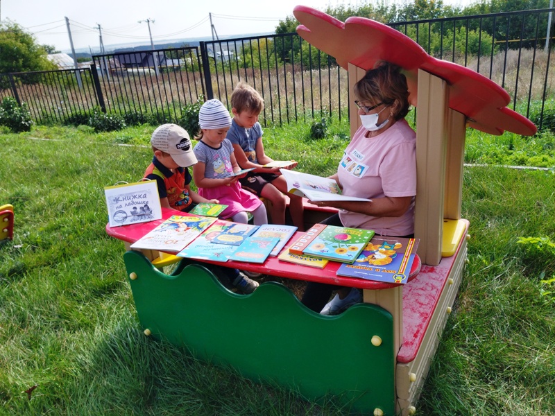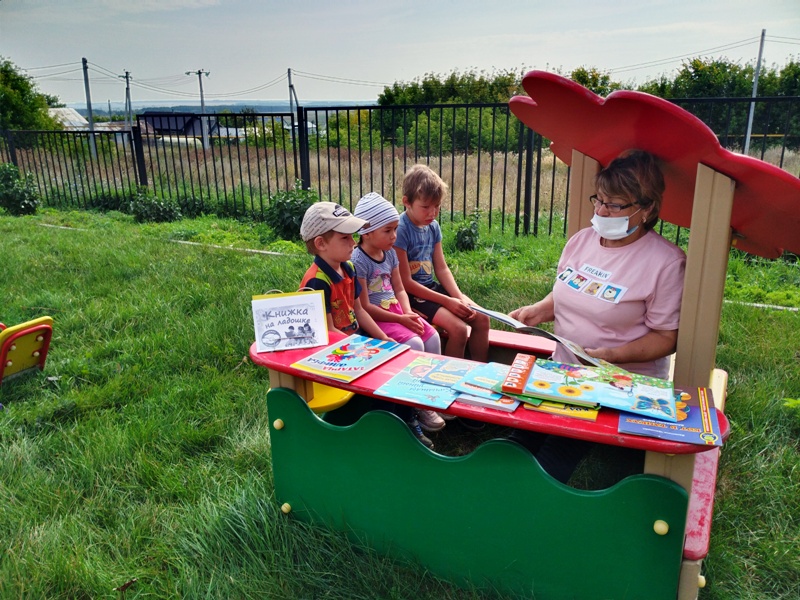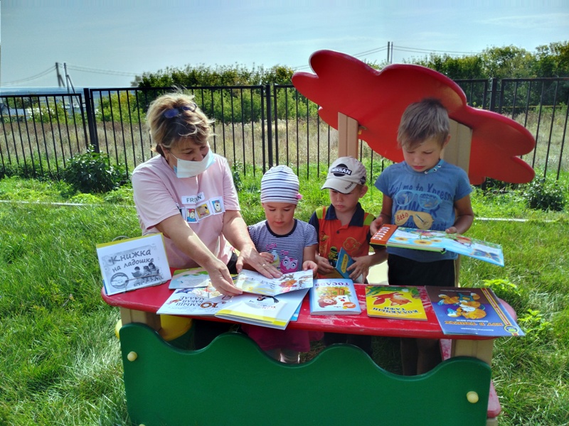 Для участия в акции «Книжка на ладошке» библиотекарь Данилова Е.И.пригласила дошкольников на детскую площадку. Она рассказала детям об акции и провела обзор у выставки. Дети с большим интересом познакомились с выставкой книг. Потом провели громкие чтения, для чтения вслух были выбраны книги В.Черняевой «Кот в тапках», А.Усачева «Жили-были ежики». Дети познакомились с лучшими произведениями современных детских писателей. Целью этой акции было привлечение детей дошкольного возраста к чтению современной детской литературы.