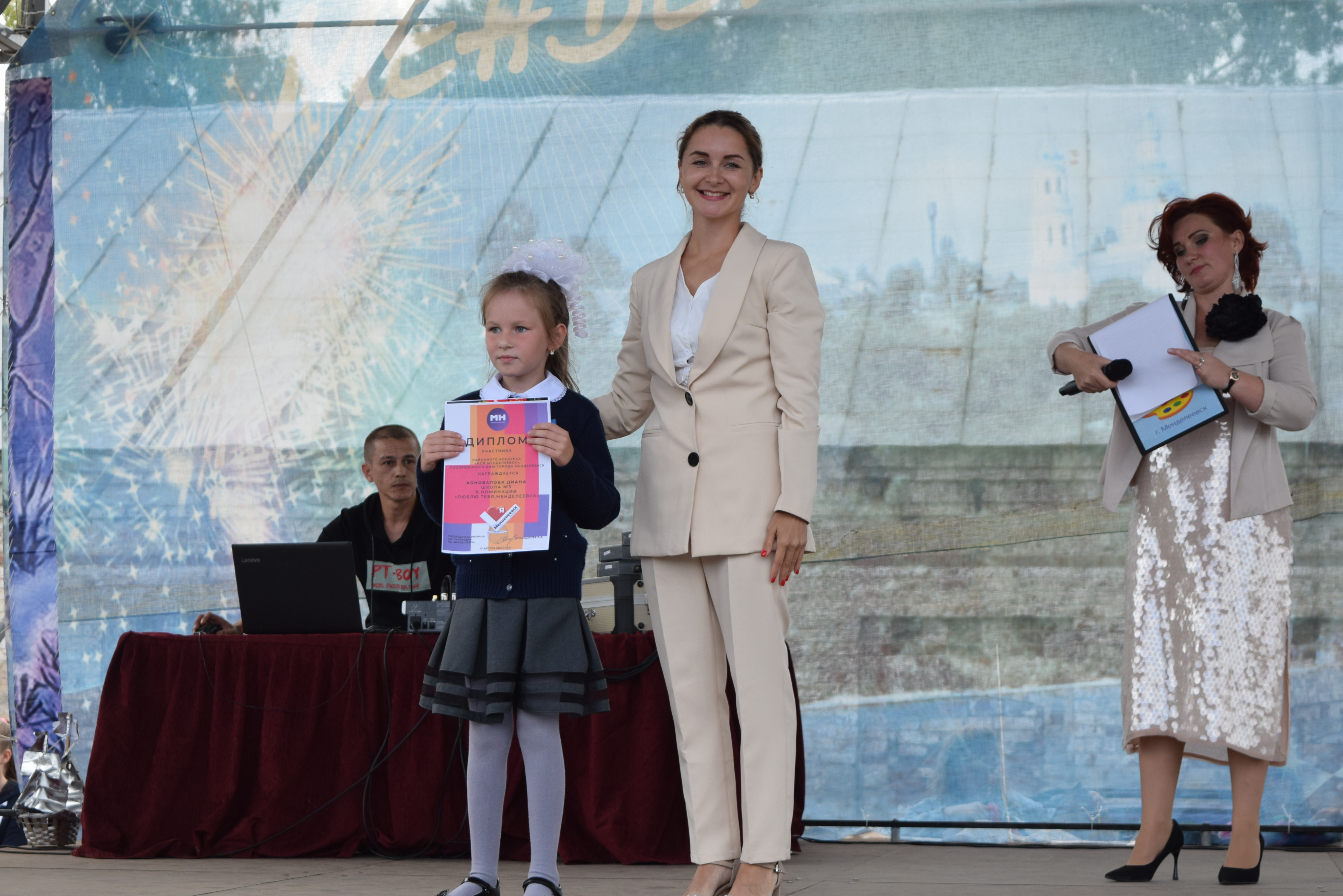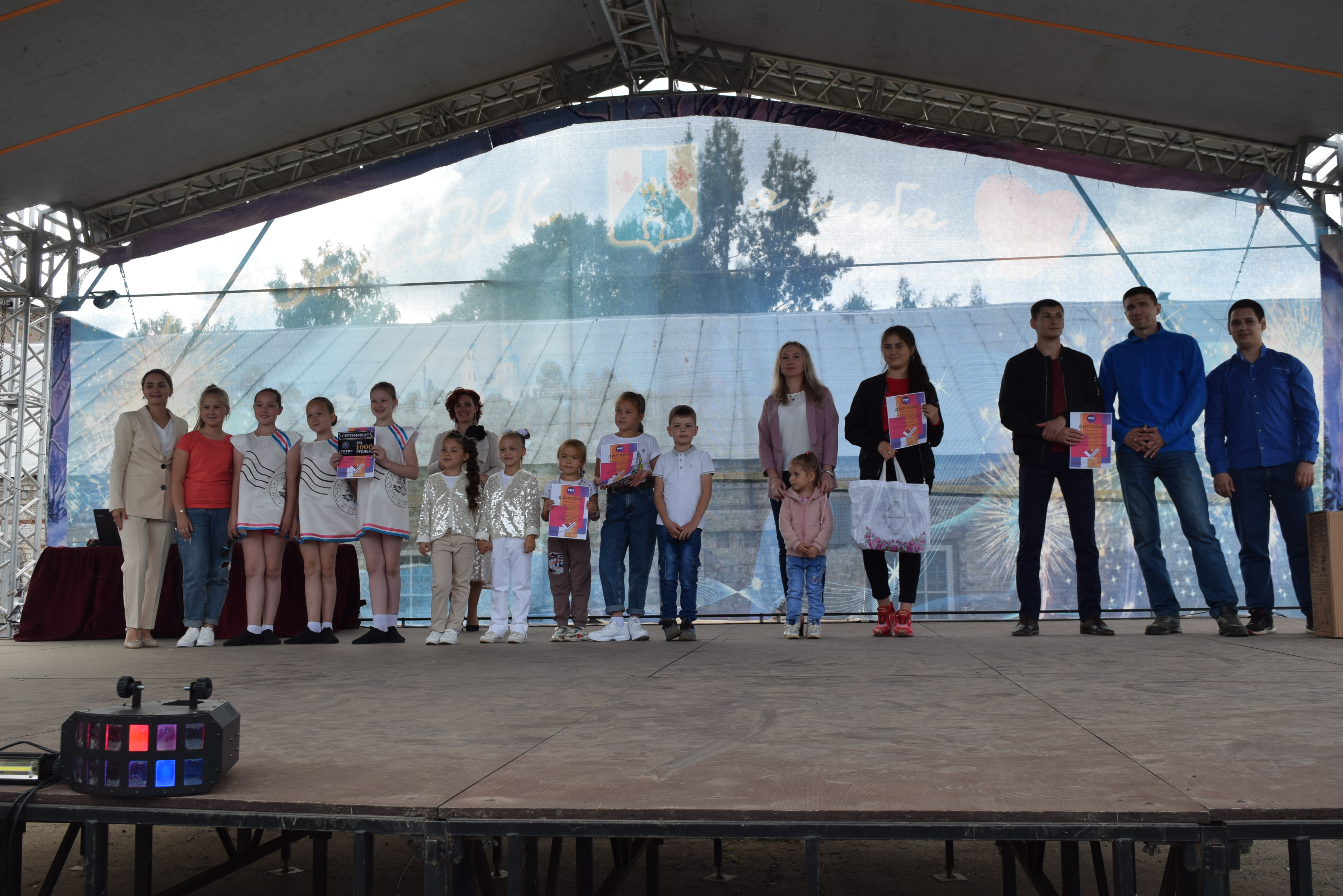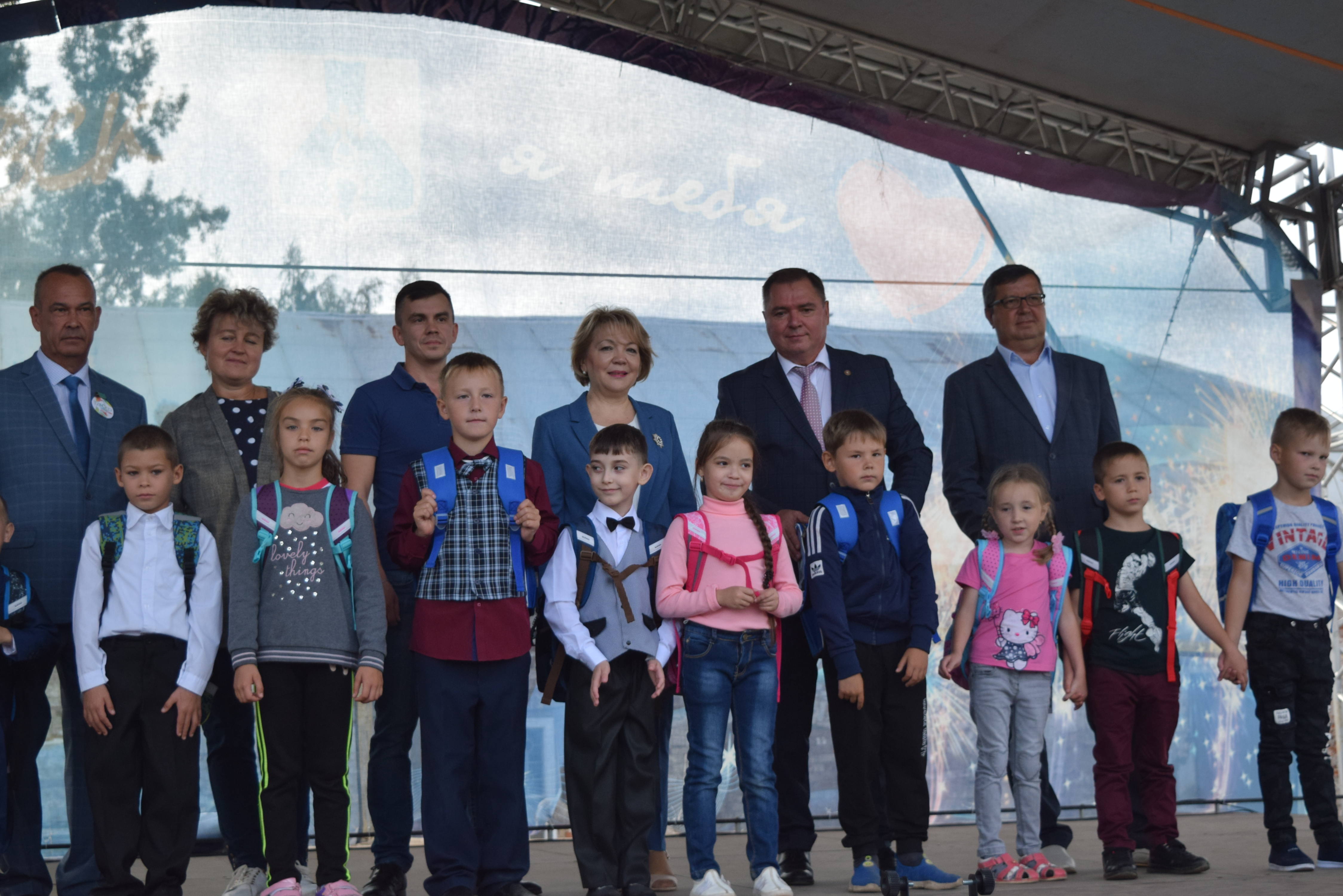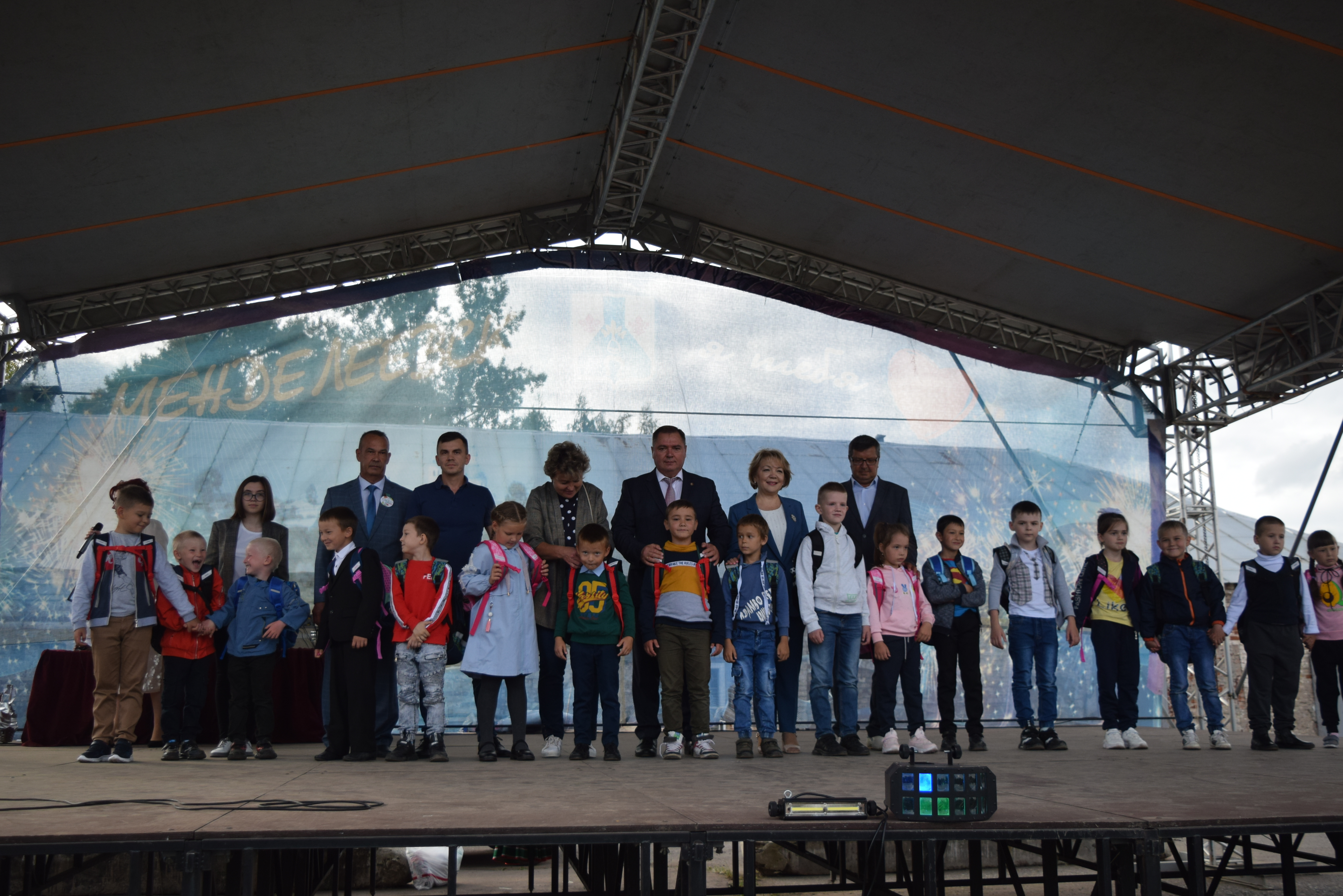 Далее на сцене Глава района поприветствовал собравшихся жителей и поздравил всех с праздником. Также 35 первоклассникам Главой района и спонсорами были вручены портфели в рамках акции "Помоги собраться в школу!". Далее прошли награждения участников и победителей конкурсов, организованных издательством "Менделеевские новости".