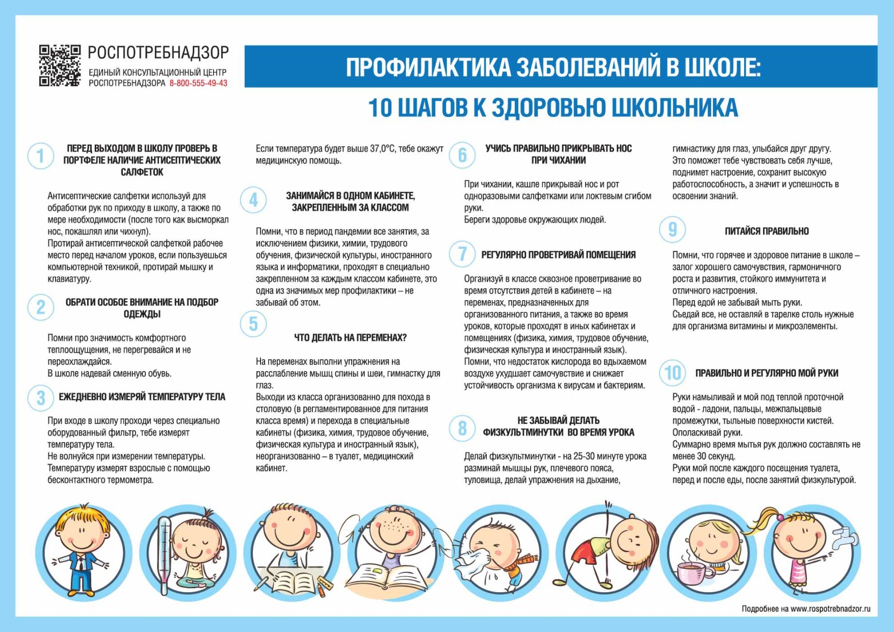 Памятка для детей по профилактике заболеваний в школе 10 шагов к здоровью школьника 1) Перед выходом в школу проверь в портфеле наличие антисептических салфеток. Антисептические салфетки используй для обработки рук по приходу в школу, а также по мере необходимости (после того как высморкал нос, покашлял или чихнул). Протирай антисептической салфеткой рабочее место перед началом уроков, если пользуешься компьютерной техникой, протирай мышку и клавиатуру. |