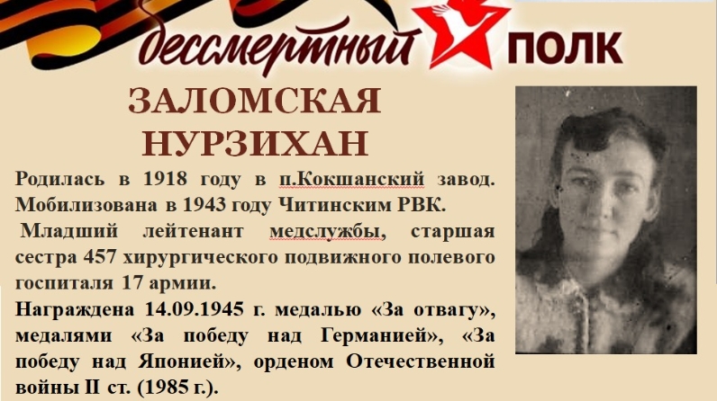 В годы Великой Отечественной войны Бондюжский районный военкомат мобилизовал 200 женщин. Но на фронтах Отечественной войны их воевало больше, так как многие наши землячки были призваны другими военкоматами. Одна из них Нурзихан Заломская. Она родилась в 1918 г. в поселке Кокшанский завод. В армии с 1943 года, призвана Читинским районным военкоматом, Читинская обл., Читинский р-н.