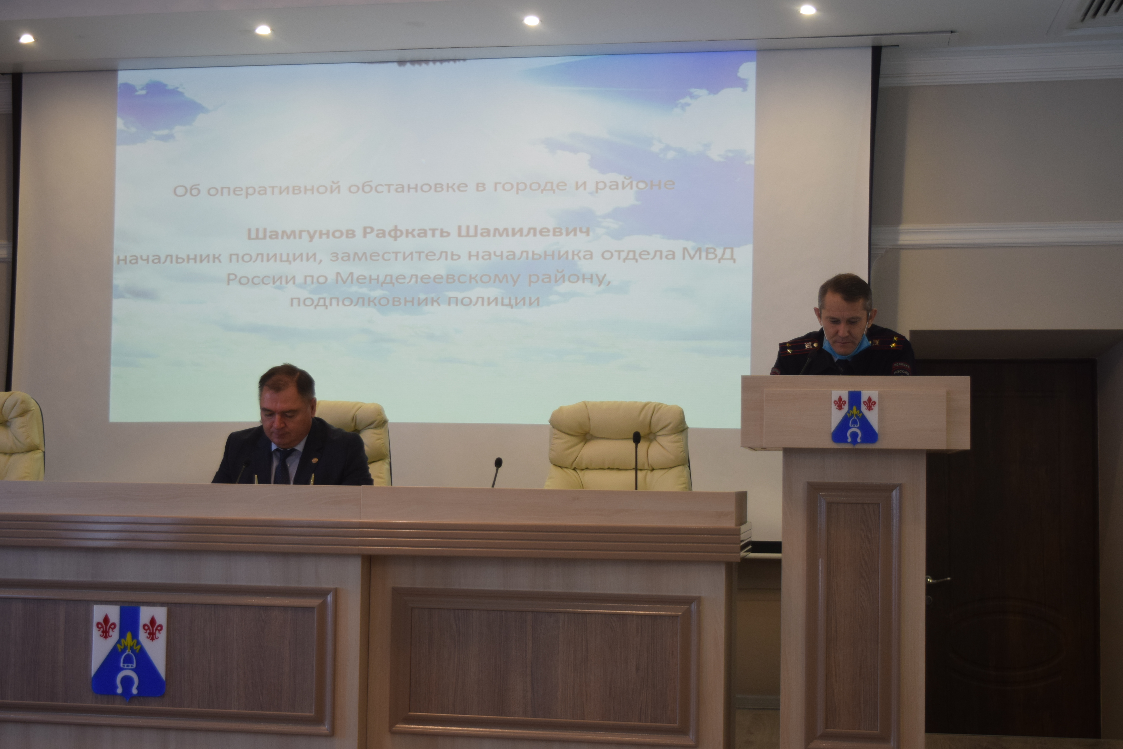 Далее об оперативной обстановке в городе и районе сообщил Рафкать Шамгунов – начальник полиции, заместитель начальника отдела МВД России по Менделеевскому району, подполковник полиции. Так, за отчётный период поступило 87 сообщений, из которых 8 преступлений.