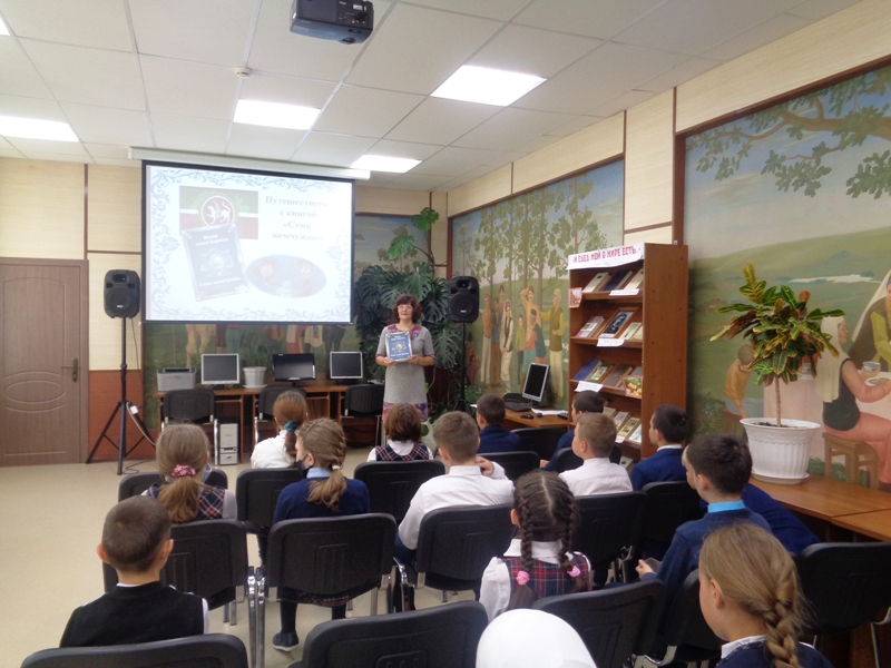 28 сентября сотрудники Центральной библиотеки провели для учащихся 4 класса школы №7 игровое путешествие с книгой «Семь жемчужин», продолжая знакомить детей с традициями и историей татарского народа.