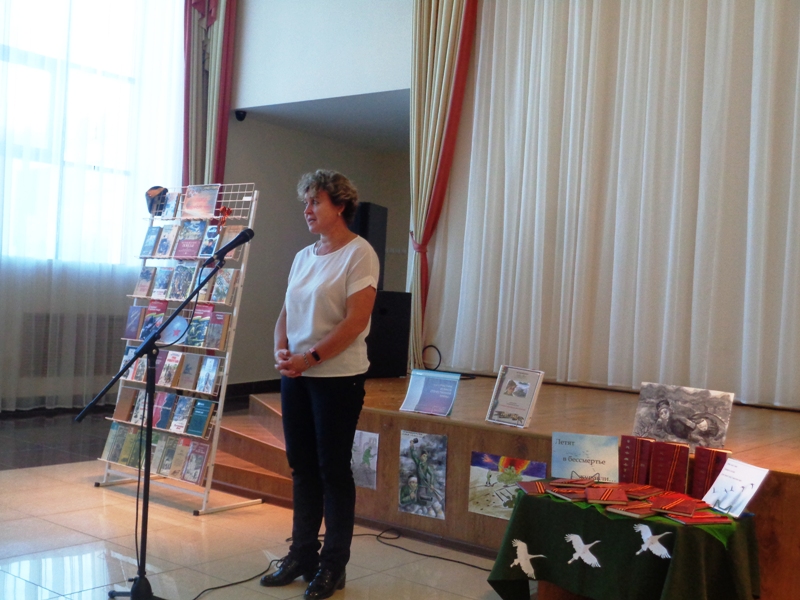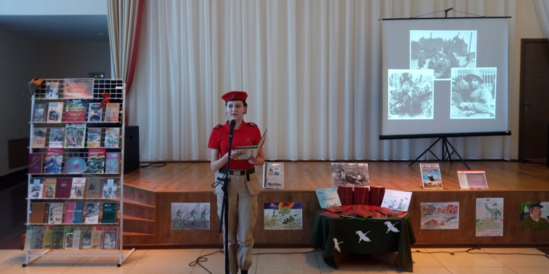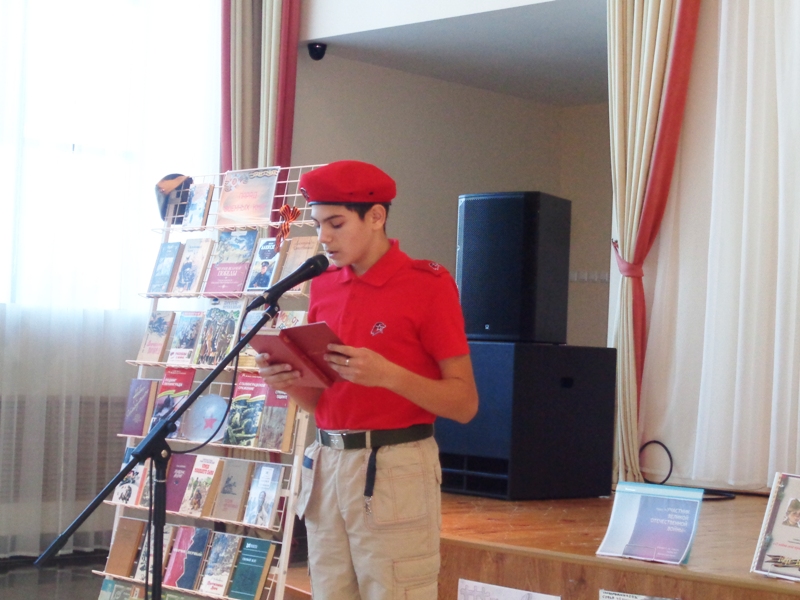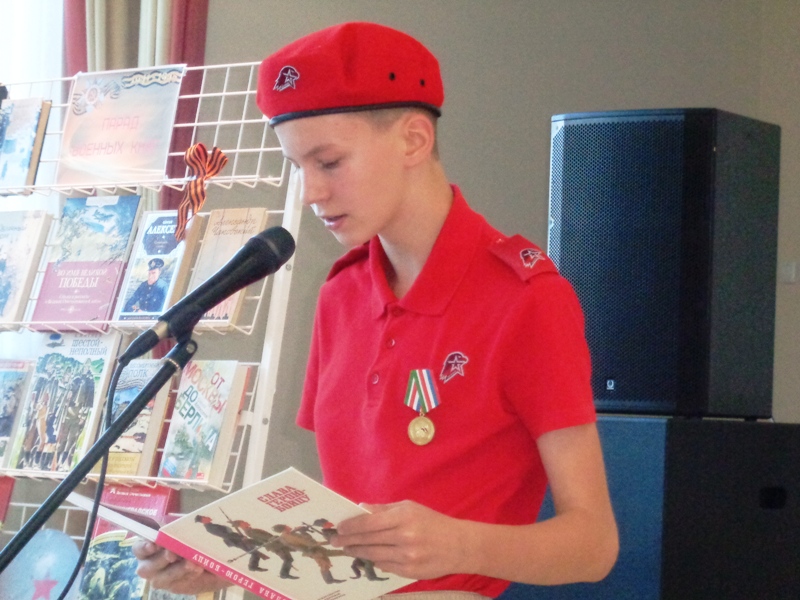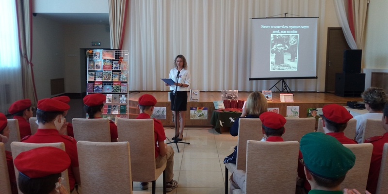На встречу была приглашена депутат городского совета Крылова М.П., которая посоветовала детям обязательно прочесть хоть одну книгу о событиях Великой Отечественной войны, ведь книги – это память о наших дедушках и бабушках, о тех людях, благодаря которым мы живём в мире на земле. Встречу открыла заместитель по работе с детьми Марготнова И.А., которая представила присутствующим документальную книгу «Медаль за бой, медаль за труд». Библиотекарь Казакова Л.М. рассказала ребятам о сынах и дочерях фронтовых полков, партизанских отрядов, подпольных организаций в тылу врага, познакомила с выставкой «Парад военных книг», которую подготовила библиотекарь Назарова Е.А. Ребята из «Юнармии» прочли стихи о событиях и людях тех страшных лет. Литературную встречу дополнила своим выступлением Комарова М.В. с песней «Дети войны».