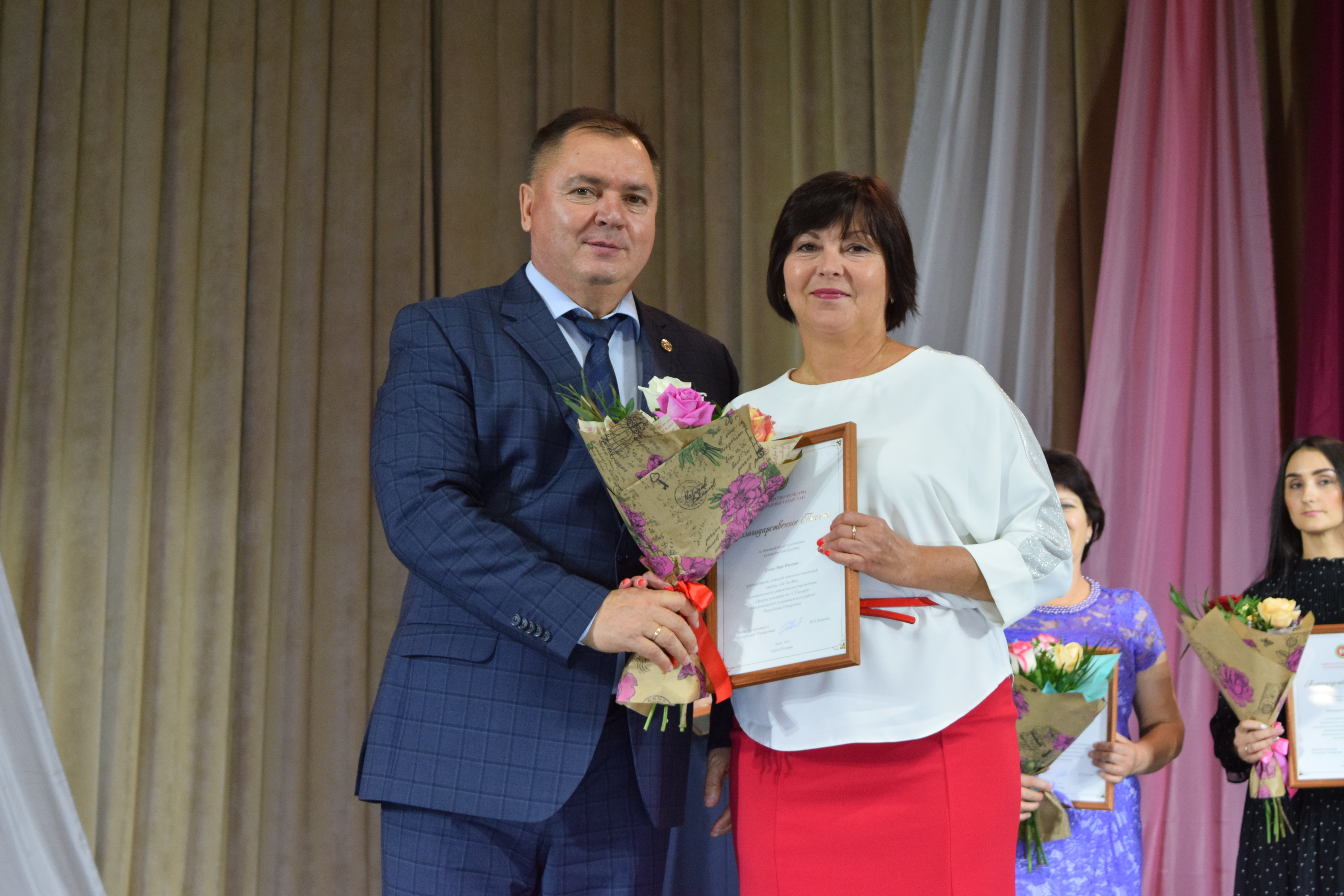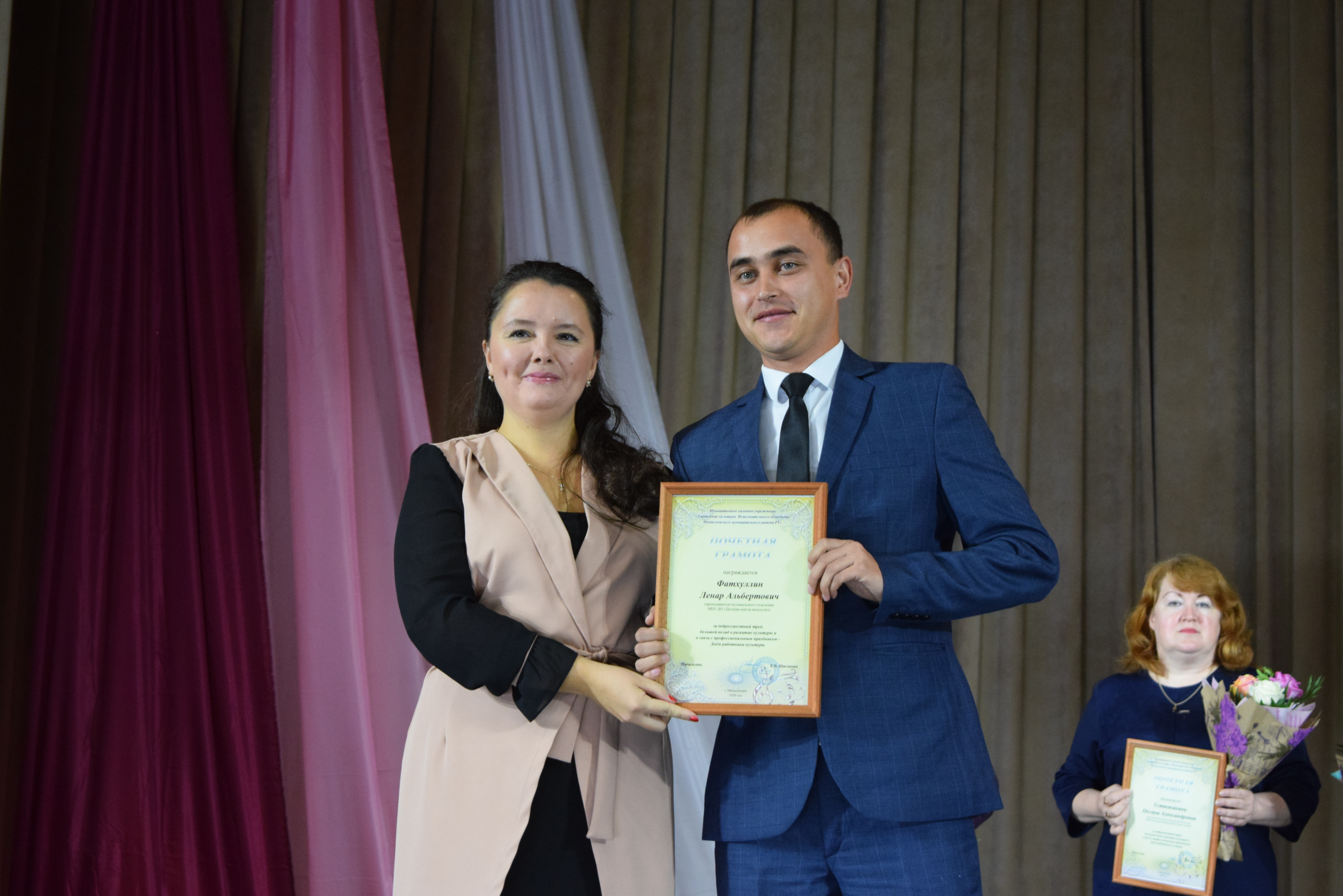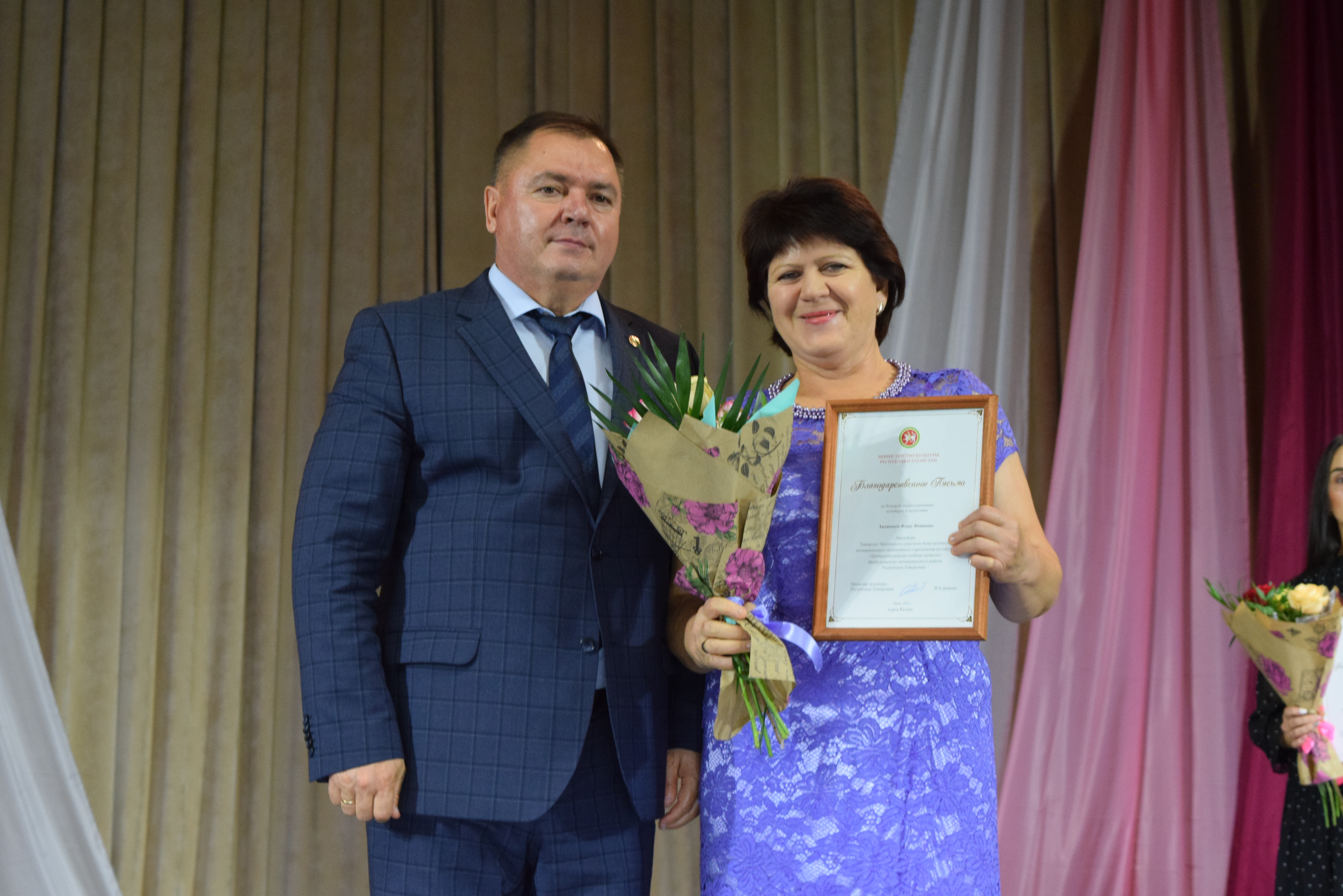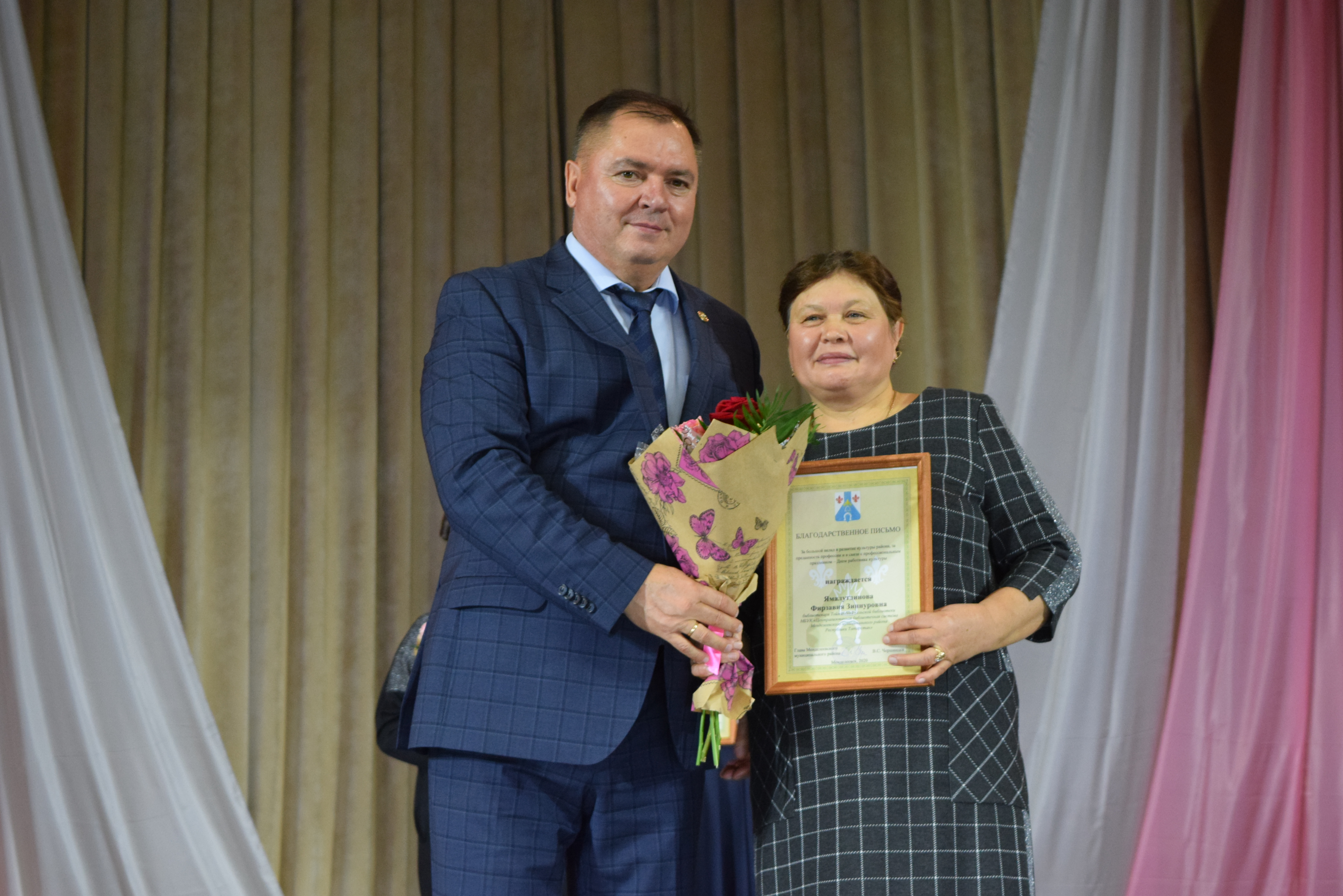 Почетными грамотами Главы Менделеевского района были награждены Екатерина Шигапова - начальник Управления культуры района, Юлия Евдокимова - зам. директора МБКУ "Централизованная клубная система Менделеевского МР РТ", Рамзия Хайруллина - методист по культурно- просветительской работе координационно-методического центра Управления культуры, Танзиля Фирсова - преподаватель музыкального отделения Детской школы искусств, Ясмнур Гизатуллина - заведующая Сетяковским сельским клубом. Также были вручены Благодарственные письма.