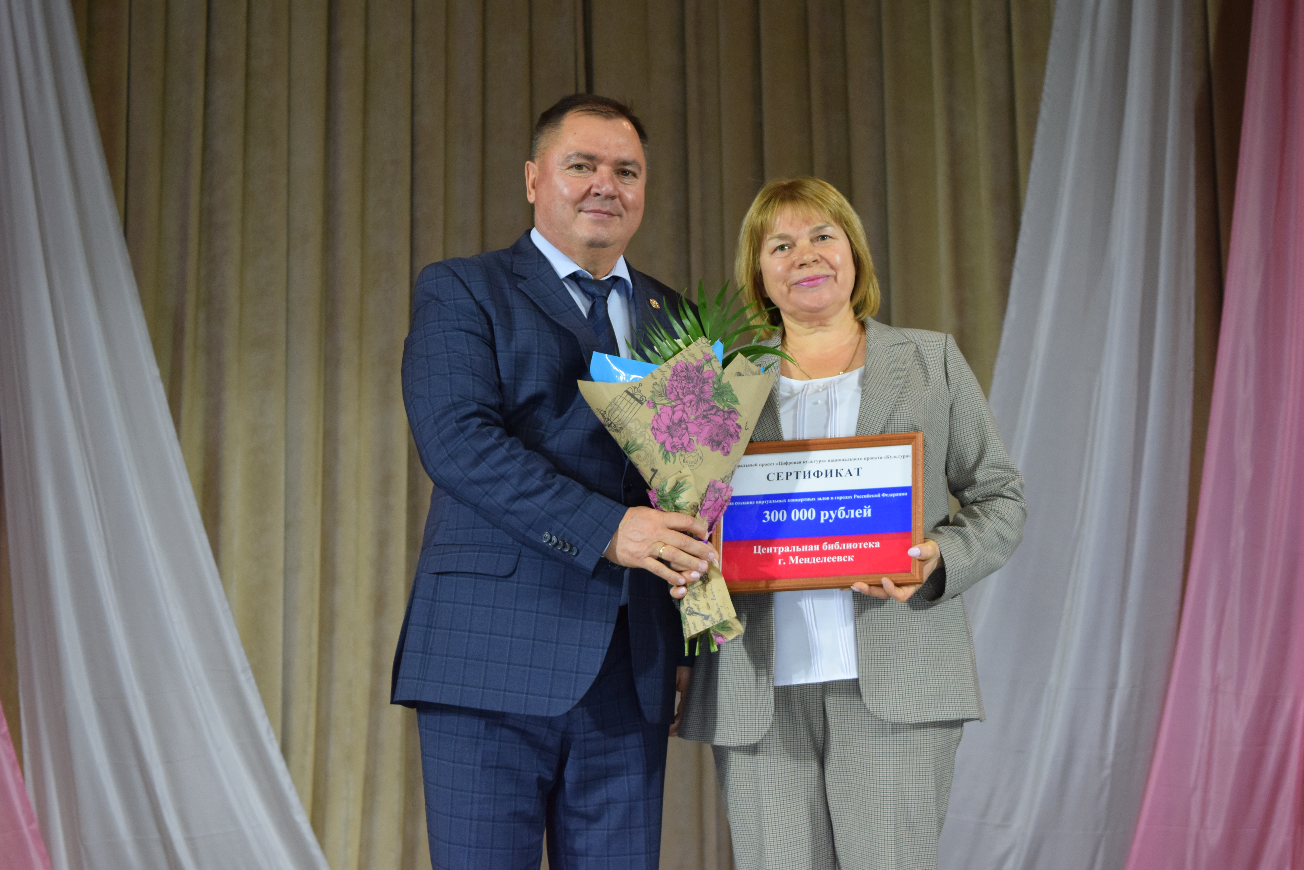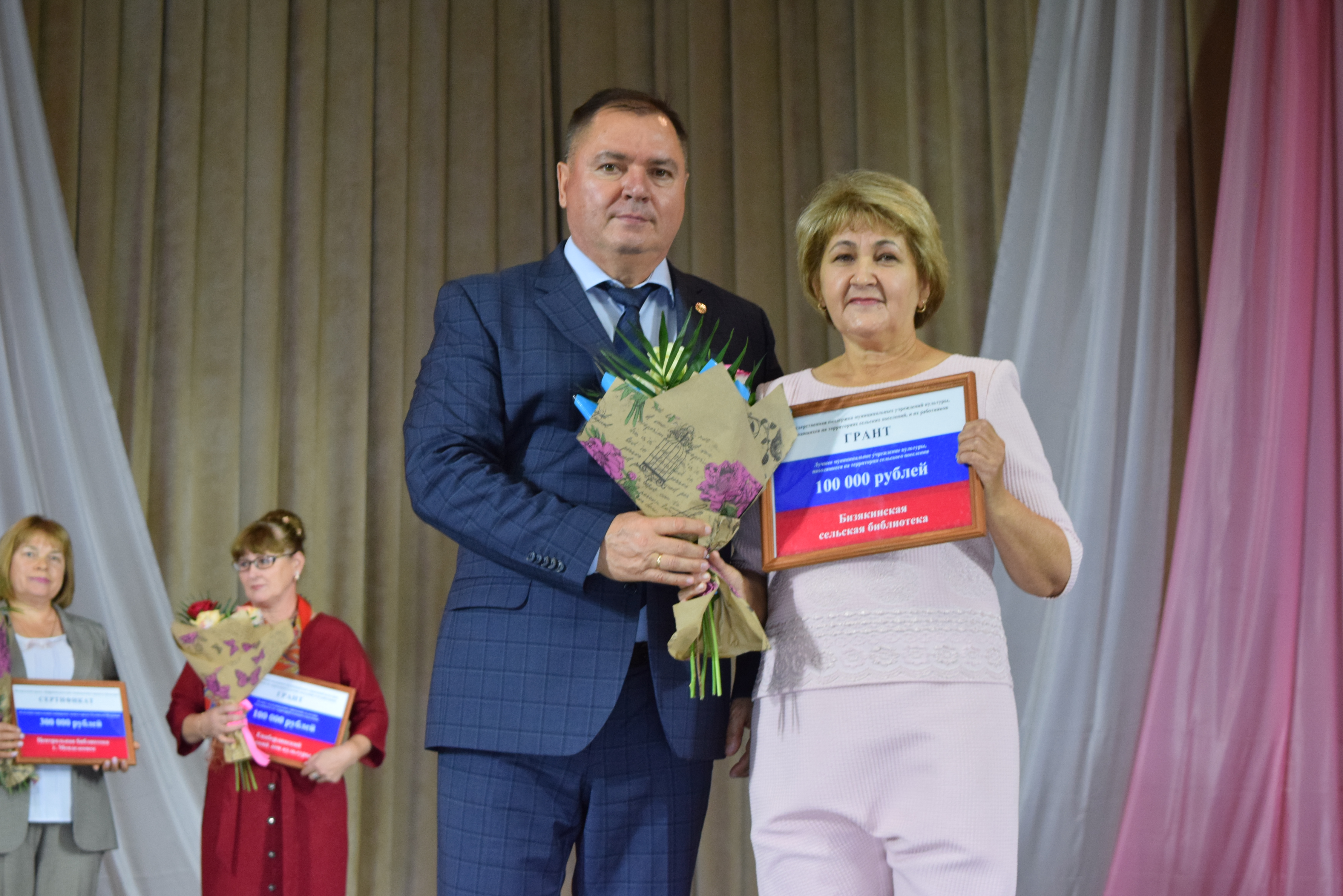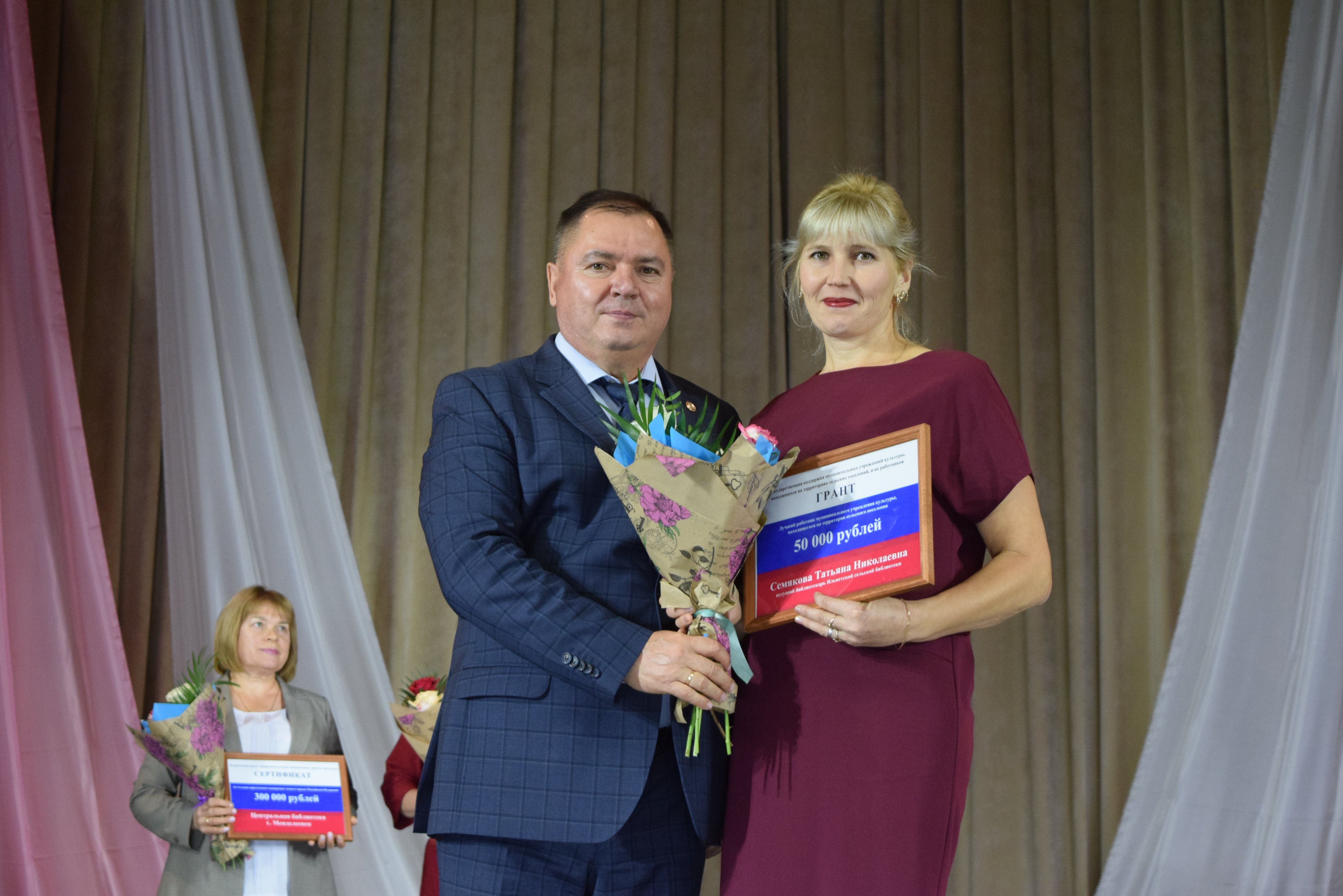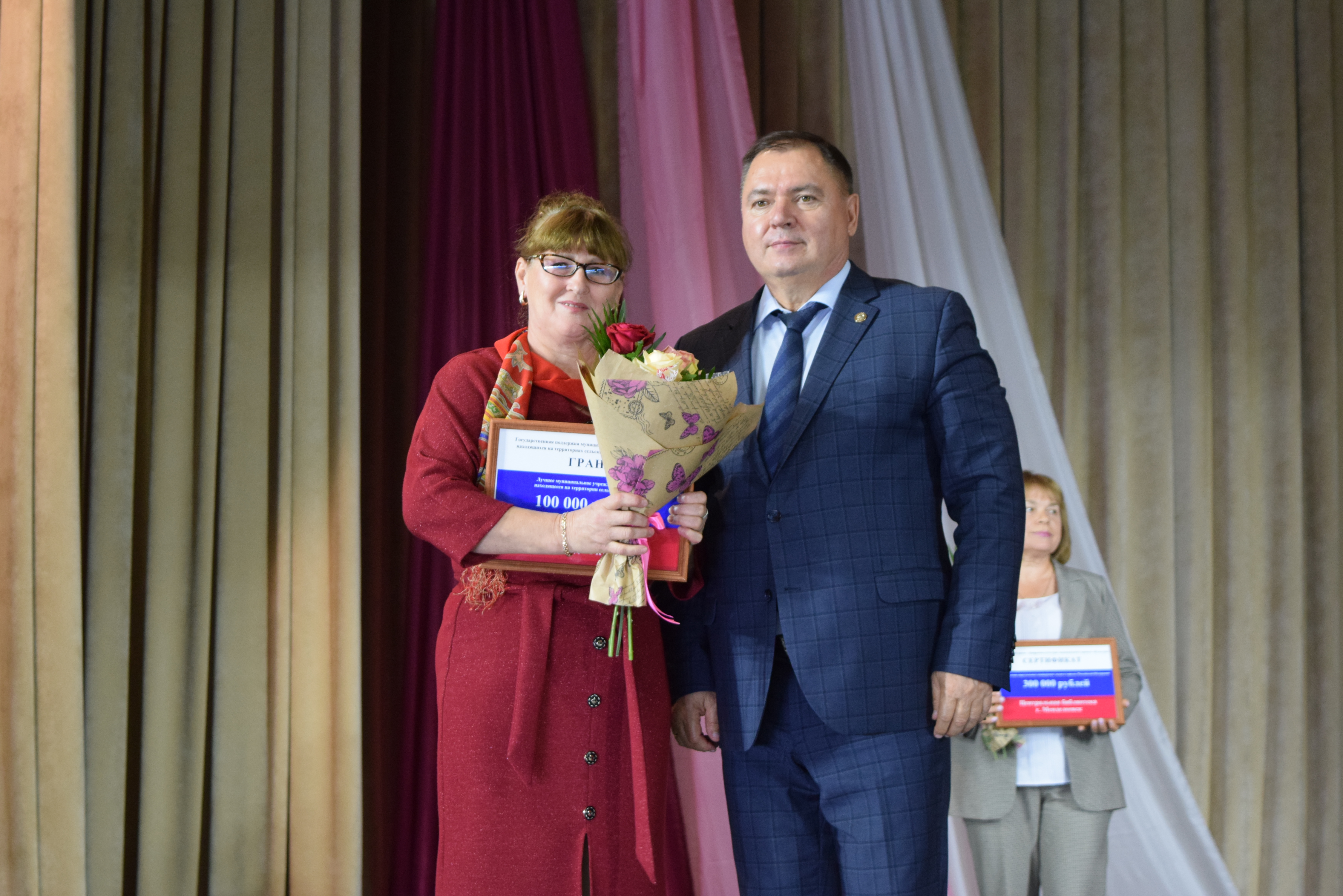 В рамках праздничного мероприятия были вручены Главой района сертификаты на гранты Центральной библиотеке по национальному проекту "Культура" - "Цифровая культура" на сумму 300 000 рублей, а также грант государственной поддержи муниципальных учреждений культуры, находящиеся на территории сельских поселений: Енабердинской сельской библиотеке и ведущему библиотекарю Ильнетьской СБ.