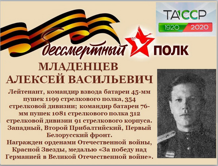 Из наградного листа: «30.11.0942 г. выкатил орудие и бил в упор по наступающим двум танкам, отразив атаку. С 1-7 декабря 1942 г. взвод т.Младенцева разрушил 4 блиндажа, подавил 4 пулеметных точки, разбил противотанковую пушку противника, уничтожил до 40 фрицев. Под сильным минометным огнем противника, маневрируя своими орудиями, сопровождал пехоту, не имея потерь в матчасти и людском составе».