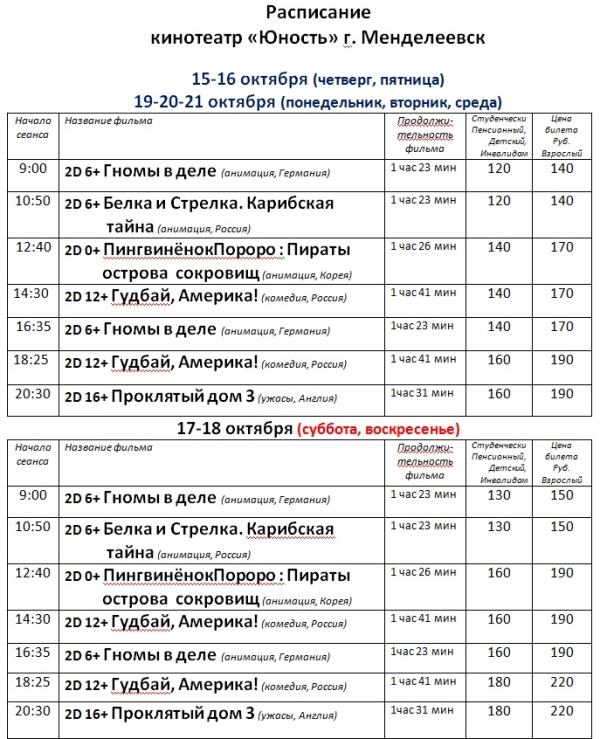 Расписание кинофильмов в кинотеатре «Юность» с 15 по 21 октября