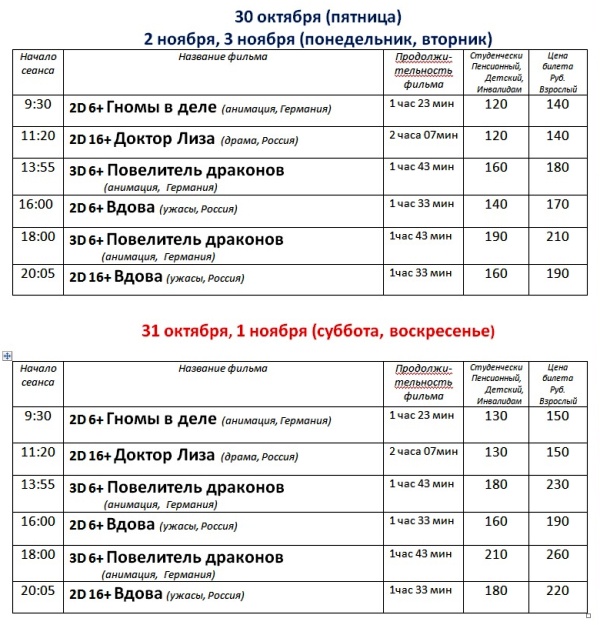 Расписание кинофильмов в кинотеатре «Юность» с 30 октября по 3 ноября