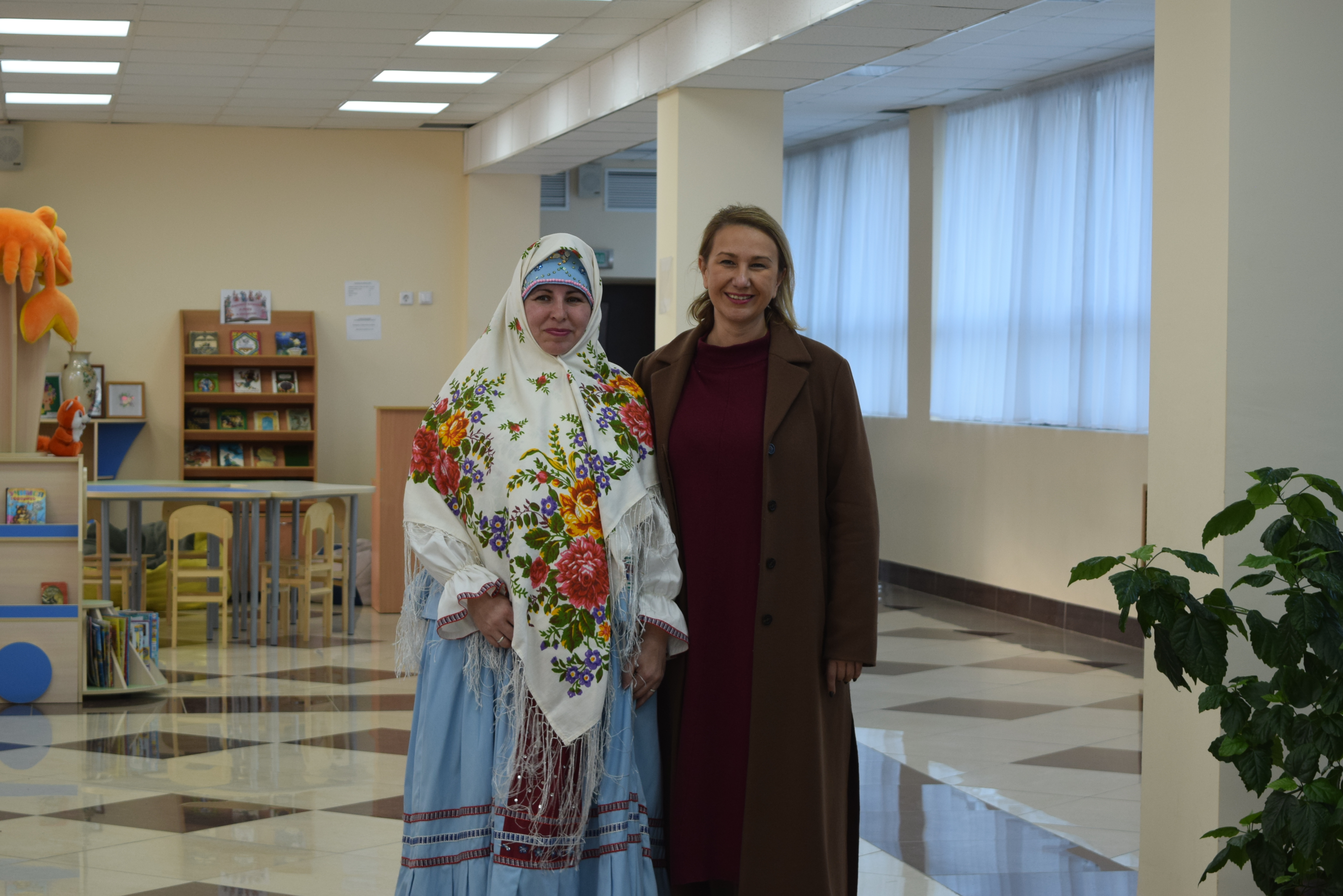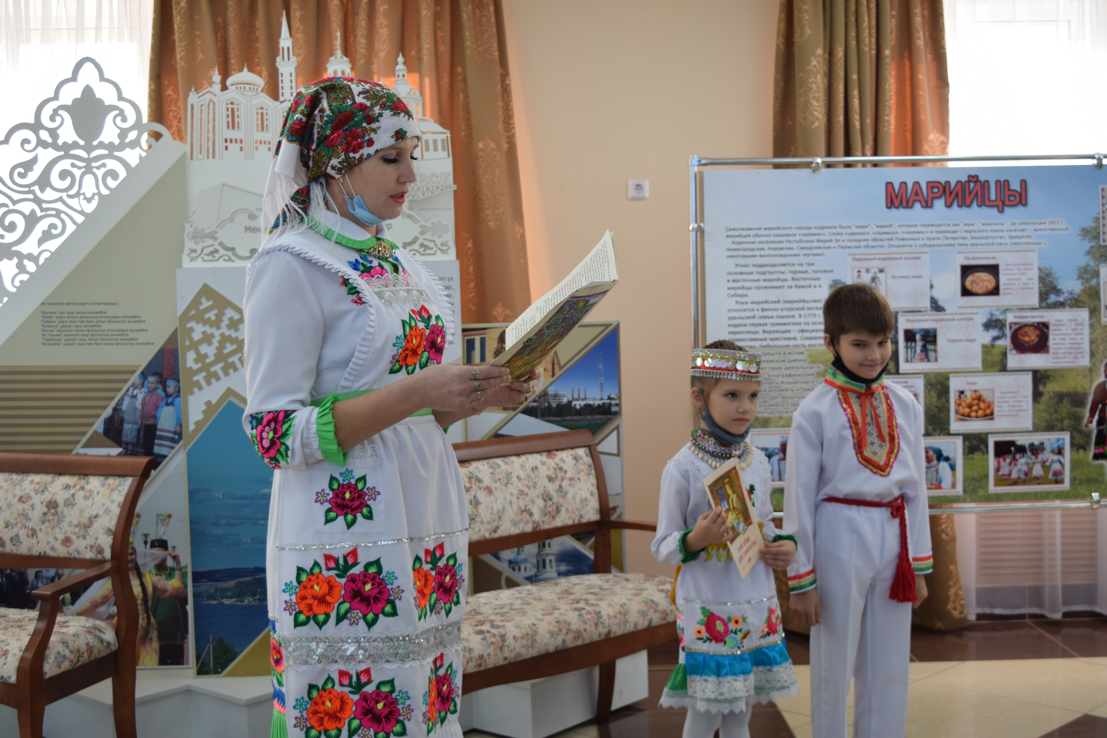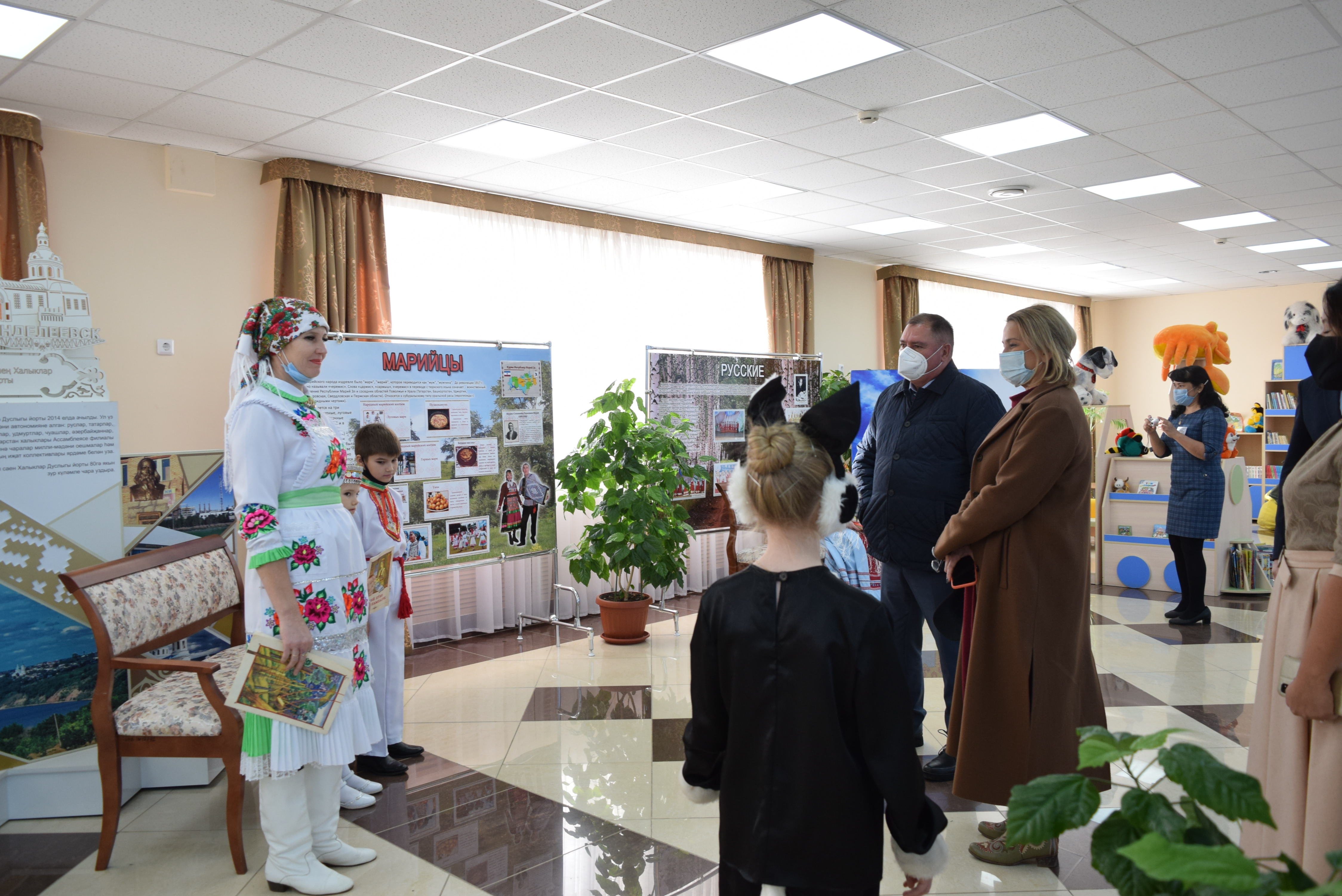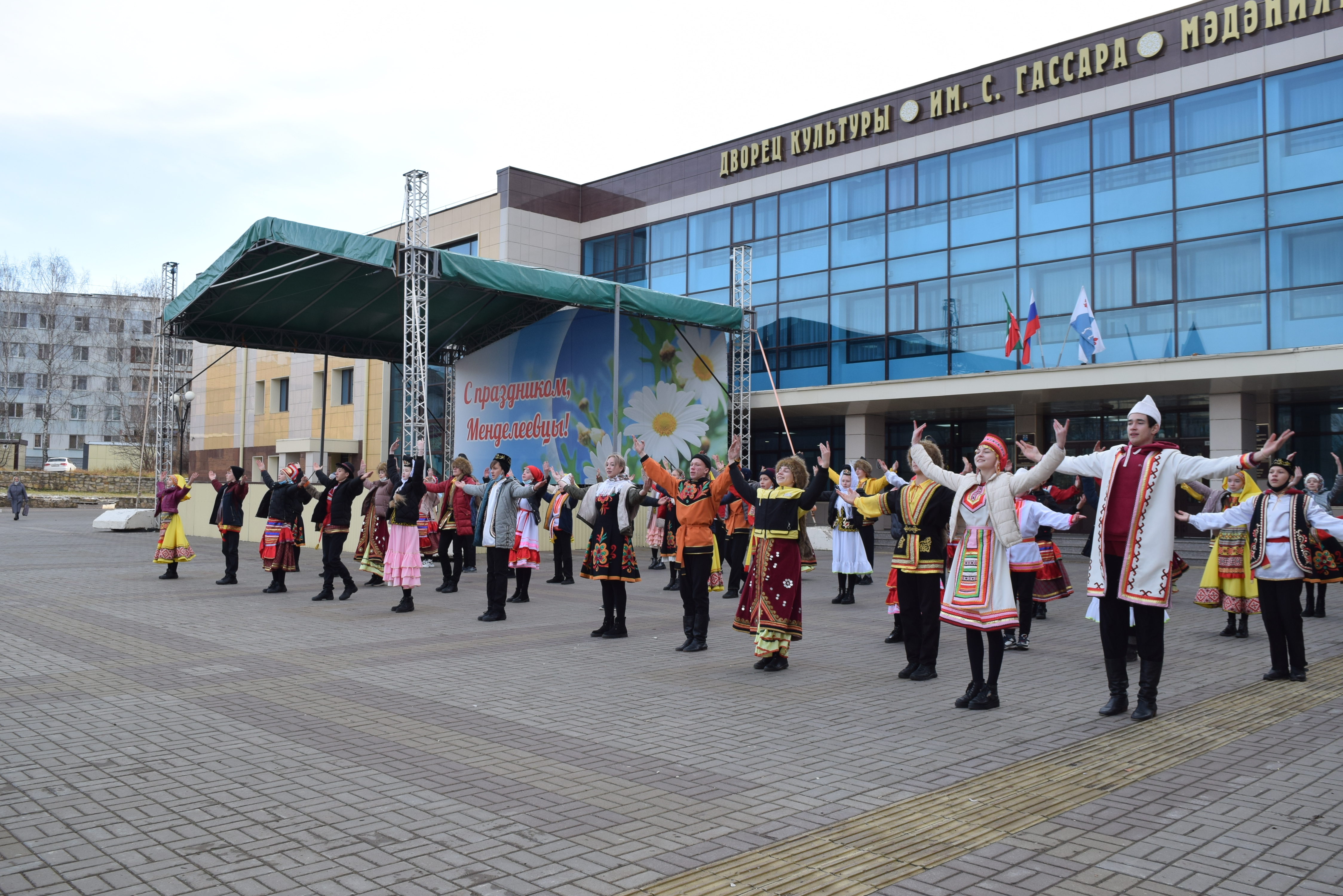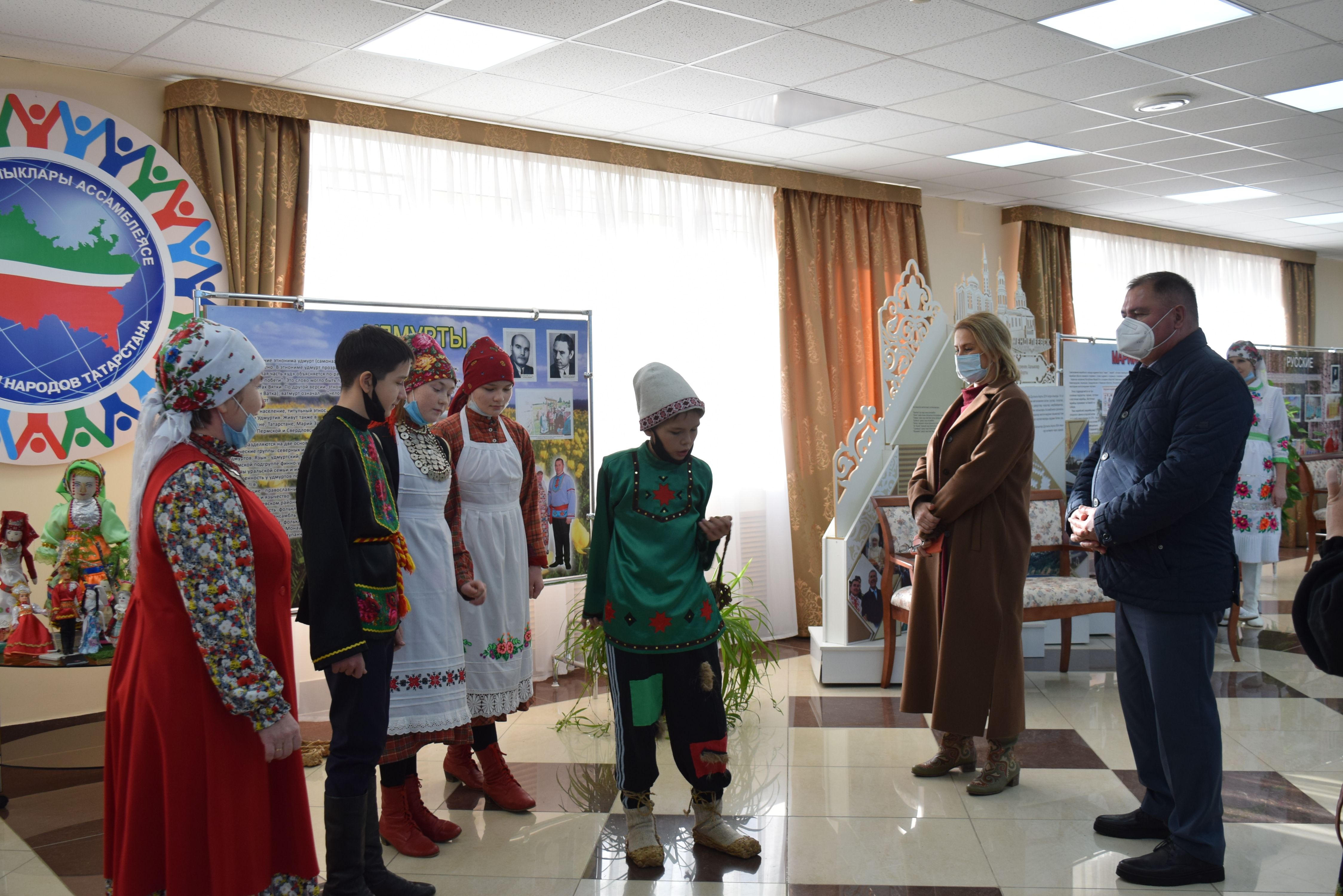Следующей площадкой для посещения стал Дворец культуры им.С.Гассара. Ярким этно-танцевальным флешмобом на площади прибывшую делегацию встретили коллективы "Кристалл" и "Шаян". Затем воспитанники Народного театра Дворца культуры им.С.Гассара встречали гостей приветствием на разных языках: татарском, русском, марийском, удмуртском, а также продемонстрировали фрагменты планируемого Фестиваля национальных сказок и читателей Централизованной и Детской библиотек.