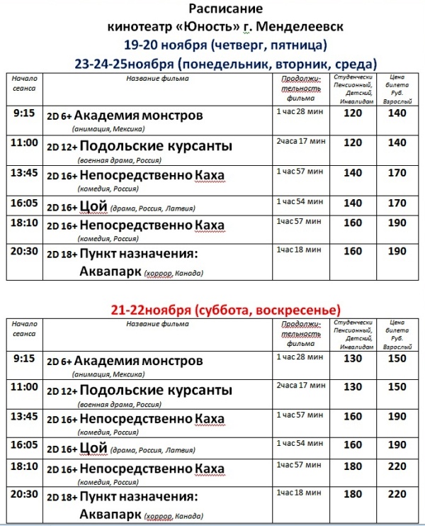 Расписание кинофильмов в кинотеатре «Юность» с  19 по 25 ноября
