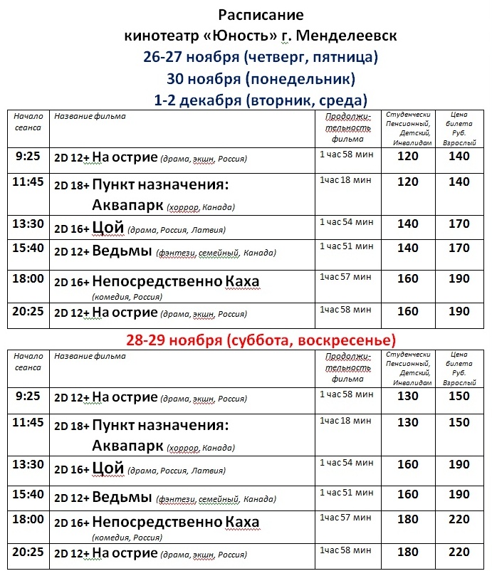 Расписание кинофильмов в кинотеатре «Юность» с   26 ноября по 2 декабря
