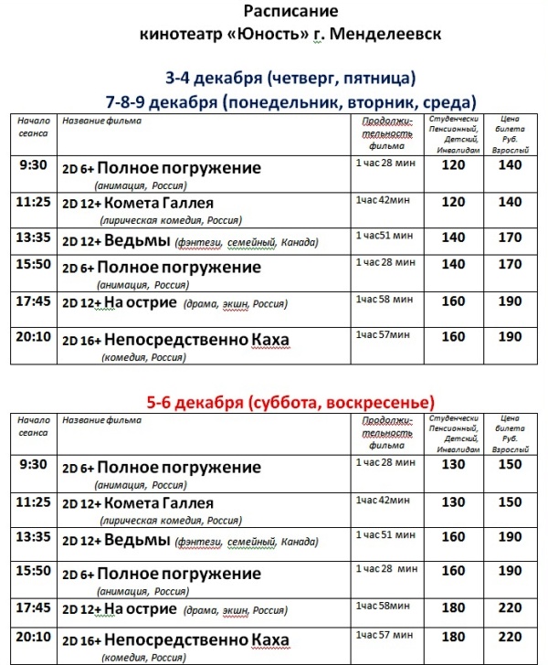 Расписание кинофильмов в кинотеатре «Юность» с 3 по 9 декабря