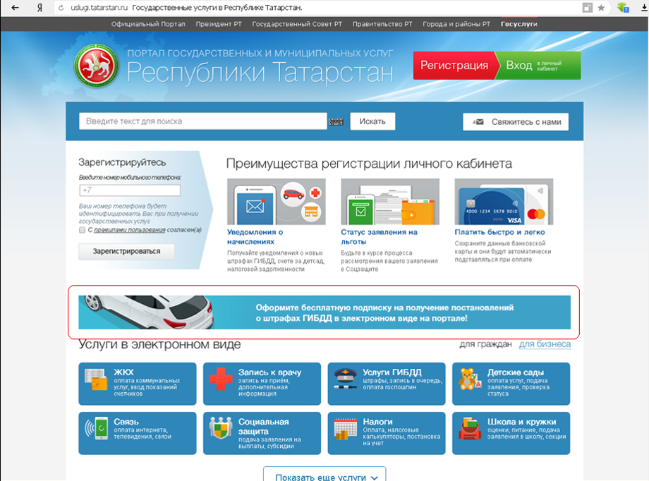 1. Для оформления подписки и получения электронных постановлений об административных правонарушениях Вам необходимо войти на портал государственных услуг РТ: https://uslugi.tatarstan.ru/